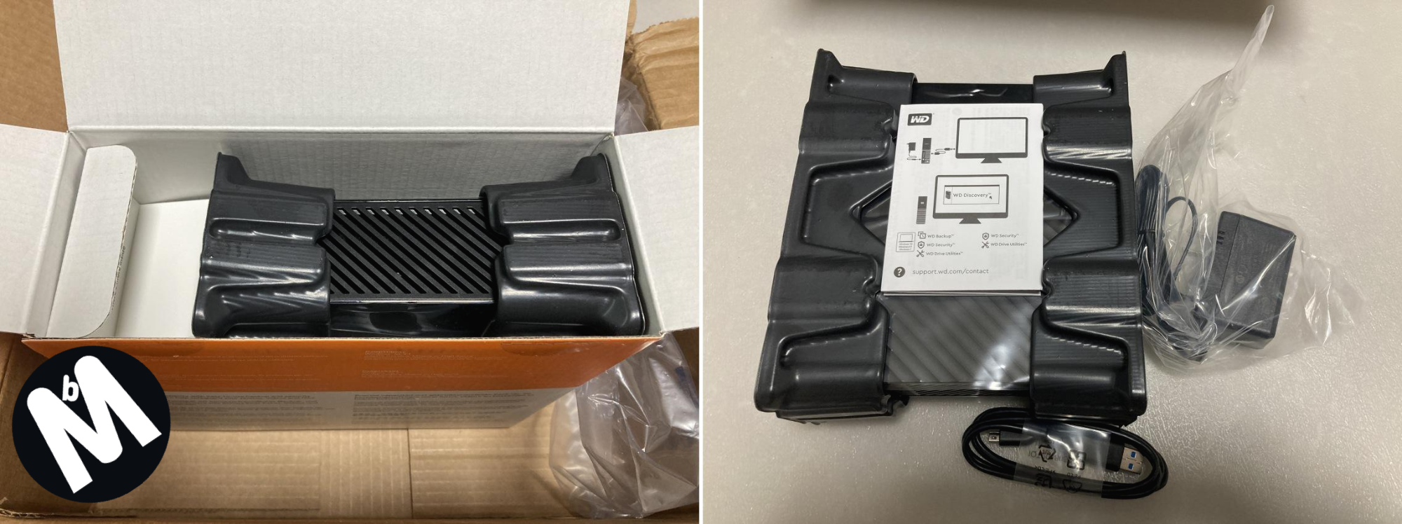 내부에는 안전하게 포장된 마이북 8TB 본체와 AC 충전기, USB3 케이블, 설명서 들이 포함되어 있었습니다. 근데 원래 마이북 모델은 충전기에 각 나라에 맞게 교환 가능한 돼지코가 들어있는걸로 알고있었는데.. 중간이 바뀐건지 없네요 ㅠ 다행히 집에 남아있던 돼지코가 하나 있어서 해결 완료.