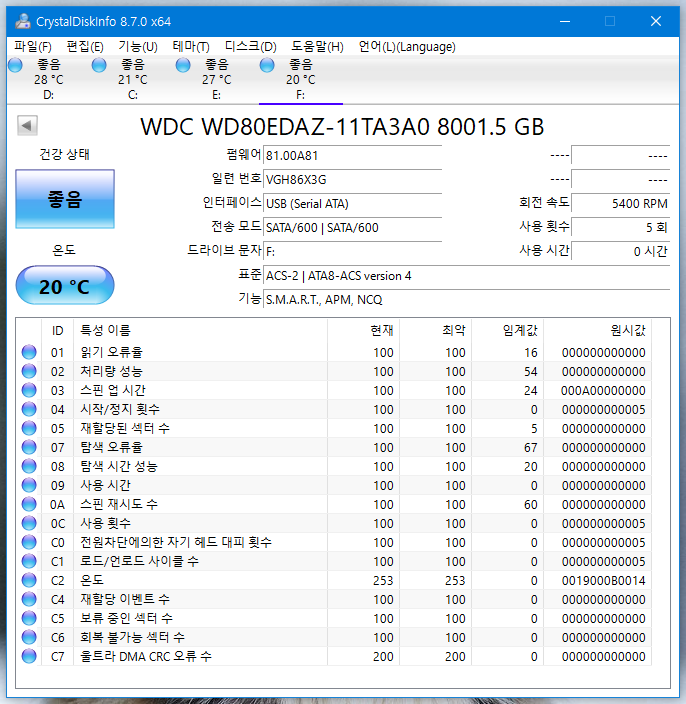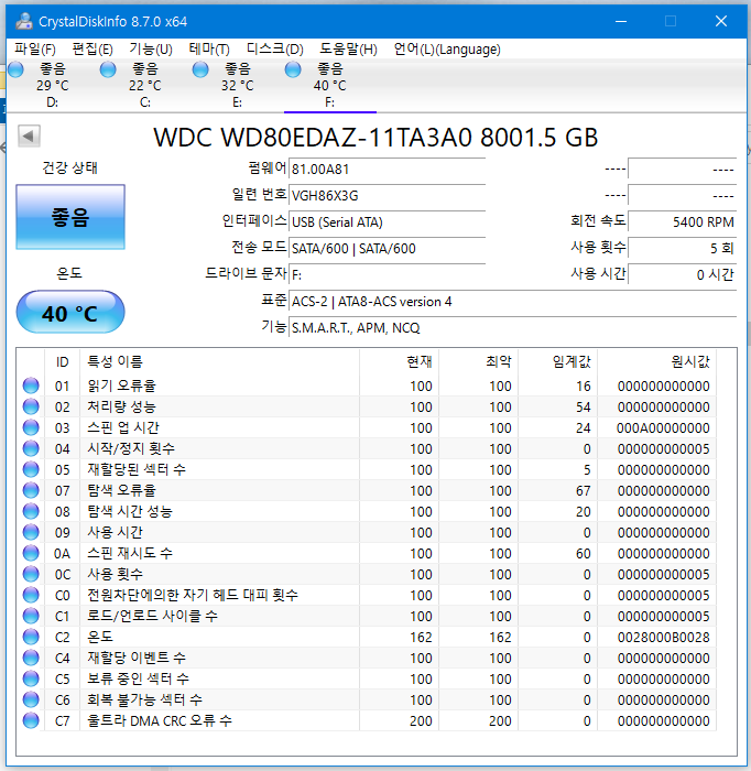 일단 하드는 WD80EDAZ-11TA3A0 이라는 모델인데 조금 당황스러웠습니다. 이게 찾아보니 보통 마이북 8TB 이상에 들어가는 하드도 아닌데다 헬륨 하드가 아니라 그냥 일반 하드였습니다. 그리고 무엇보다도 아래에서 다시 언급하겠지만 사용중에 온도가 미칠듯이 올라가더군요. 무려 59도까지 올라갔습니다 ㅠㅠ