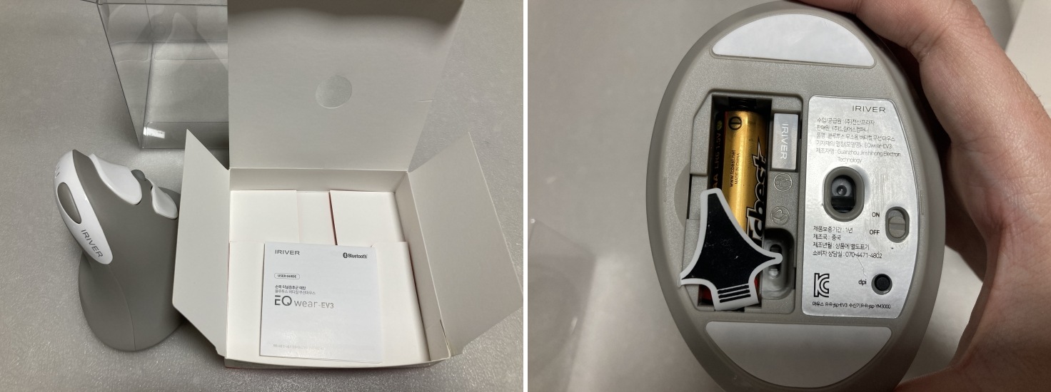 구성품은 아이리버 마우스, 무선 2.4G 리시버, AA건전지, 사용설명서 4가지로 구성되어 있습니다. 마우스 아래쪽에 AA건전지가 기본적으로 들어가있고 바로 그 옆 작은 공간에 2.4G 무선 리시버가 들어있습니다.