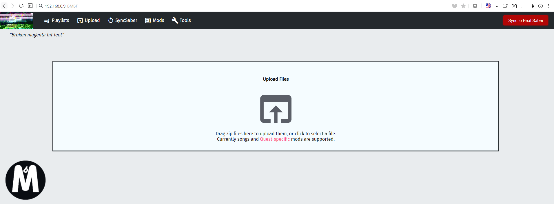 2) 주소창에 입력하면 위와 같은 페이지로 진입됩니다. 이제 이 화면에 위에서 다운로드 받은 "Songloader.qmod" 파일을 그대로 드래그(Drag)하여 Upload Files 공간에 넣어줍니다.