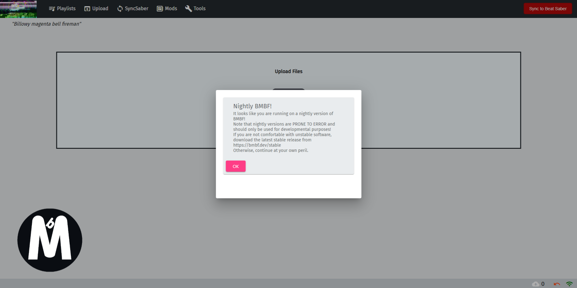 BMBF 나이틀리는 정식버전이 아닌, 어디까지나 개발 테스트 빌드이기 때문에 사용에 따라 크고 작은 버그들이 있을 수 있으며 "커스텀곡" 외에는 다른 기능은 지원되지 않습니다.