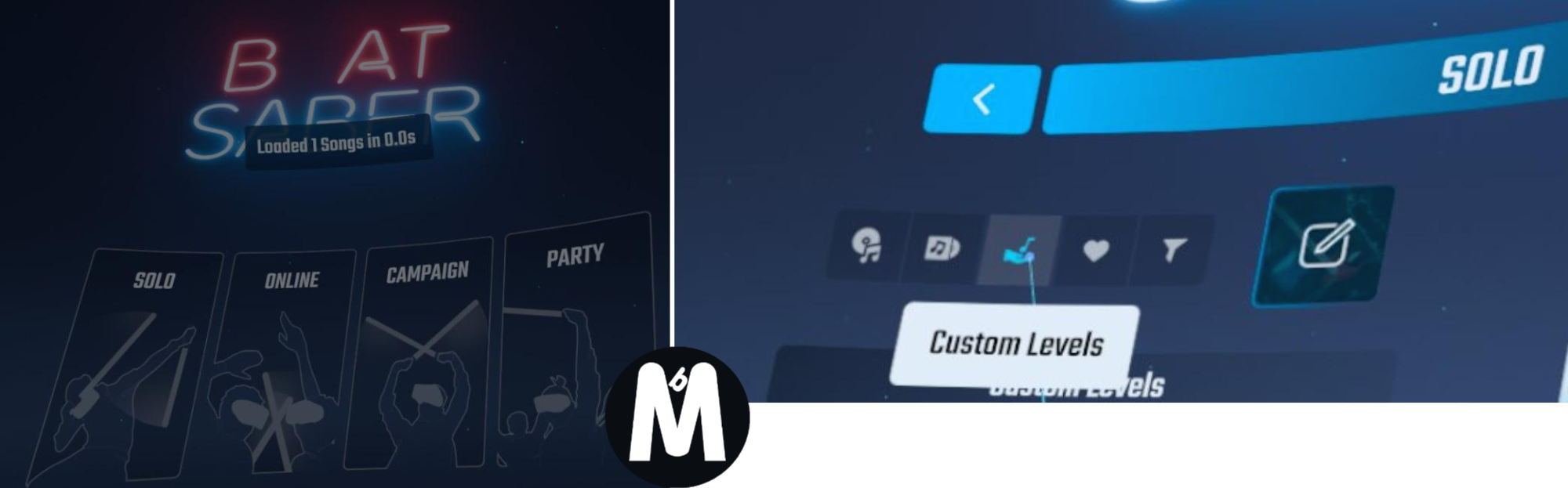 5) 설치가 제대로 됐을경우, 비트세이버 실행시 로고에 "Loaded (곡수) songs in (걸린시간)s" 라는 문구가 보이며 메뉴 진입시 노래 목록 탭에 "Custom Levels"라는 탭이 생기게 됩니다. 만약 이게 안뜨신다면 다시 진행하셔야 합니다.