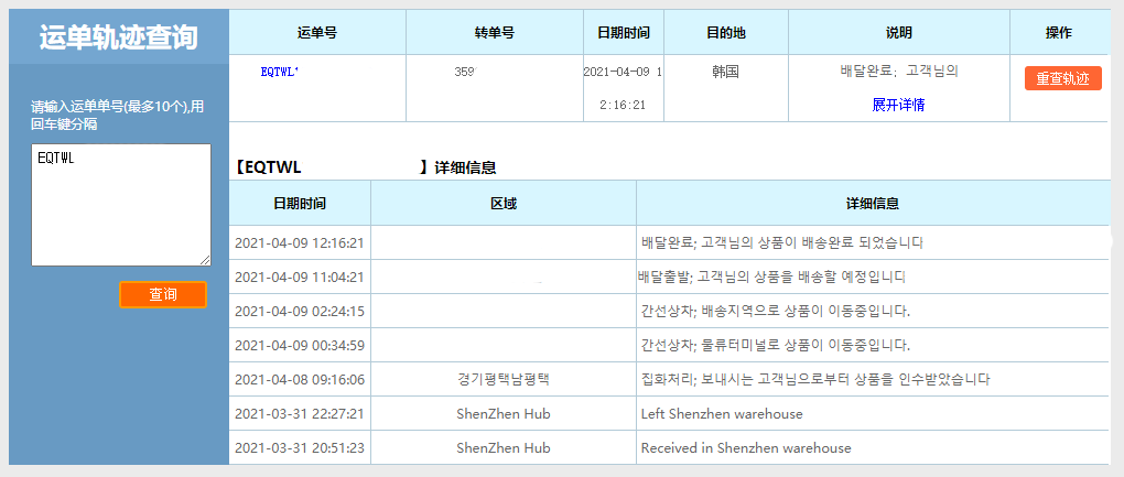 참고로 운송장 번호가 EQTWL로 시작하는데, 轨迹查询 (kingtrans.cn) 에서 조회하면 디테일하게 국내 송장번호까지 알 수 있습니다. 배송 과정은 아래 사진을 참조하세요.