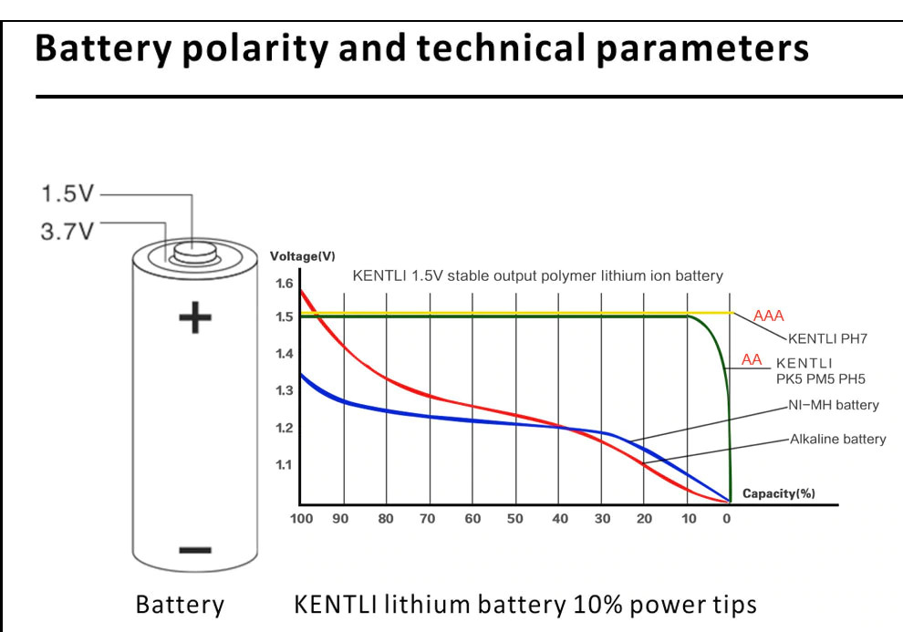 거기다가 켄틀리 충전지가 좋은 이유가 3000mAh라는 높은 용량, 가볍고 오래가는 리튬이온 충전지라는 이유도 있지만, 위의 사진을 보시듯, 보통 건전지는 배터리가 닳으면 닳을수록 전압이 점점 떨어지는데 켄틀리 충전지는 배터리가 닳는 그 순간까지 1.5V를 유지해주기 때문입니다.