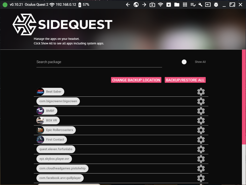 퀘스트2 본체를 사용하고 계신 PC와 연결한 다음, 사이드 퀘스트 프로그램을 실행시킵니다. 사이드퀘스트 프로그램 상단에 있는 큐브 모양의 아이콘을 클릭하면 현재 퀘스트2에 설치된 앱 목록이 뜹니다.