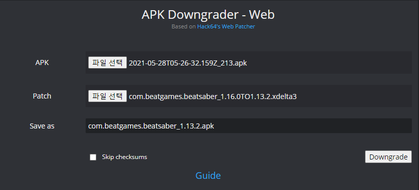 다운그레이드를 위해 'APK Downgrader - Web' 항목에 APK파일과 Patch 파일을 불러와줍니다. 다 불러오면 아래에 있는 Downgrade 버튼을 눌러주면 빠르면 5초안에 파일이 다운로드가 완료됩니다.
