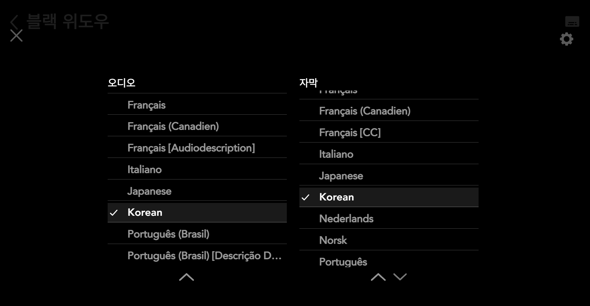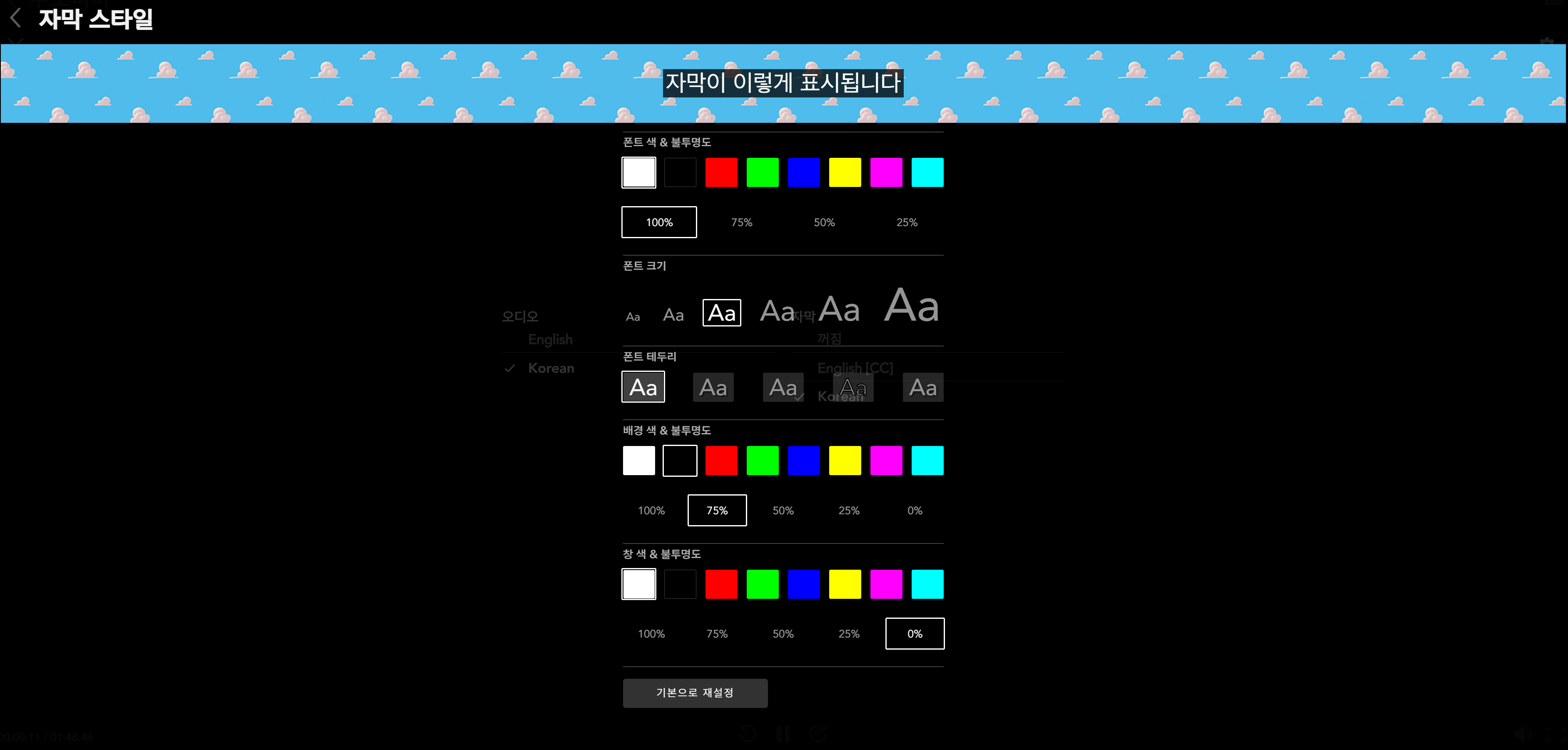 영상을 처음 틀면 한국어 더빙으로 기본설정 되어있는데 우측 상단에 있는 자막표시 아이콘을 누르면 언어설정이 가능합니다. 여기서 오디오와 자막 언어를 설정할 수 있고 또다시 우측 상단에 있는 톱니 바퀴 모양을 누르면 자막 크기 및 색상 설정이 가능합니다.