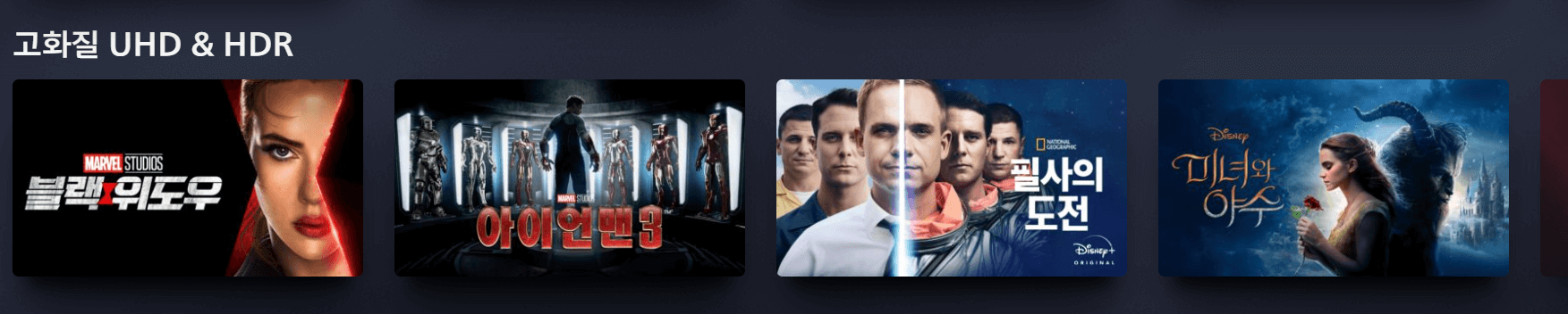 만... 아쉬운점은 TV(혹은 IPTV, 애플tv같은 셋톱박스)에서만 4K 및 HDR 영상들이 지원된다는 것입니다. 모바일이나 PC환경에서는 시청할 수 있는 화질이 1080P(FHD)가 최대라고 합니다. 정확한 기종별 지원 화질은 디즈니+의 데이터 사용 및 스트리밍 품질 | Disney+ (disneyplus.com) 해당 링크에서 조회가 가능합니다.