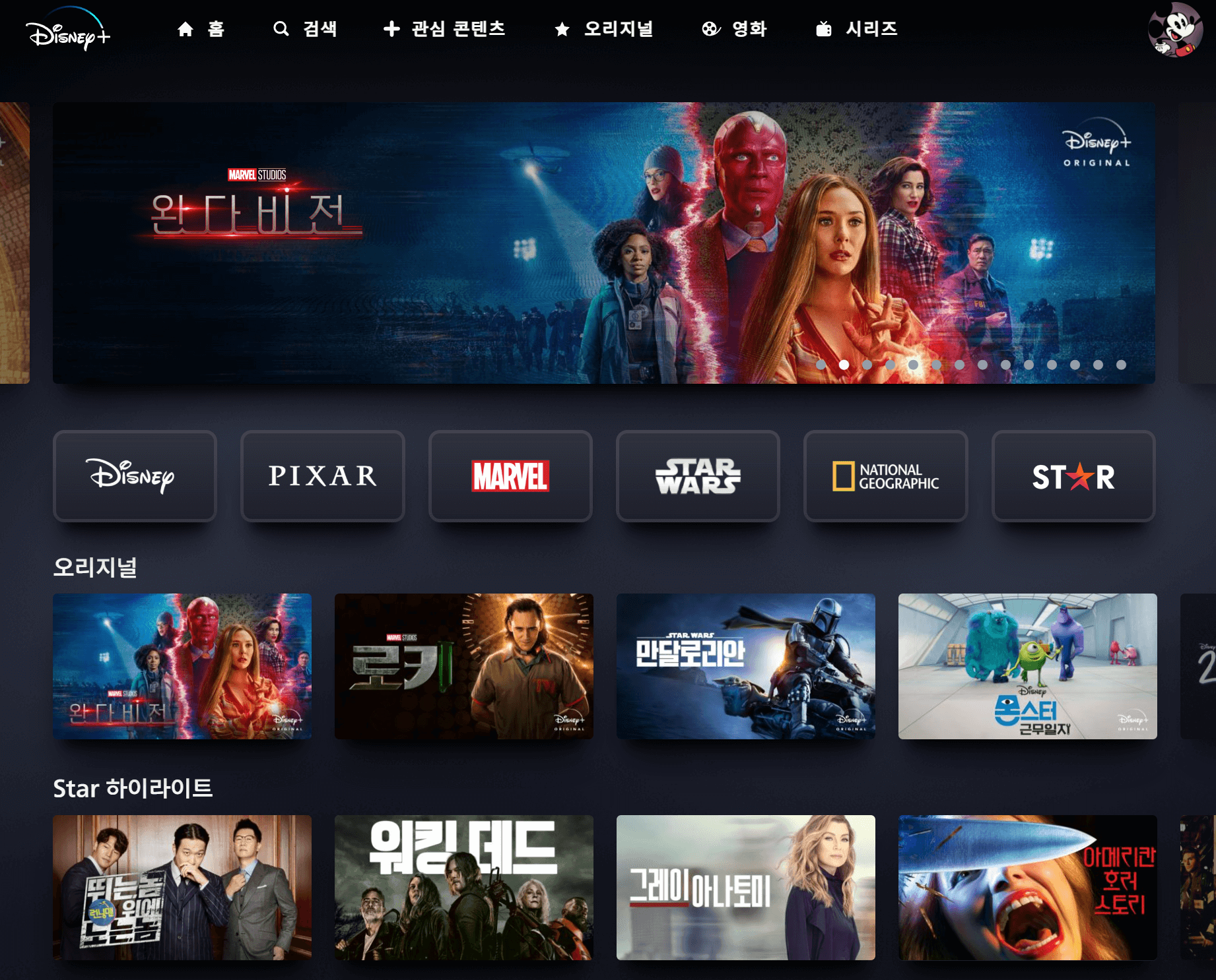 디즈니 플러스의 메인화면 입니다. 반독점법에 아슬아슬 걸쳐져있는(?) 디즈니답게 컨텐츠는 정말 방대합니다.
