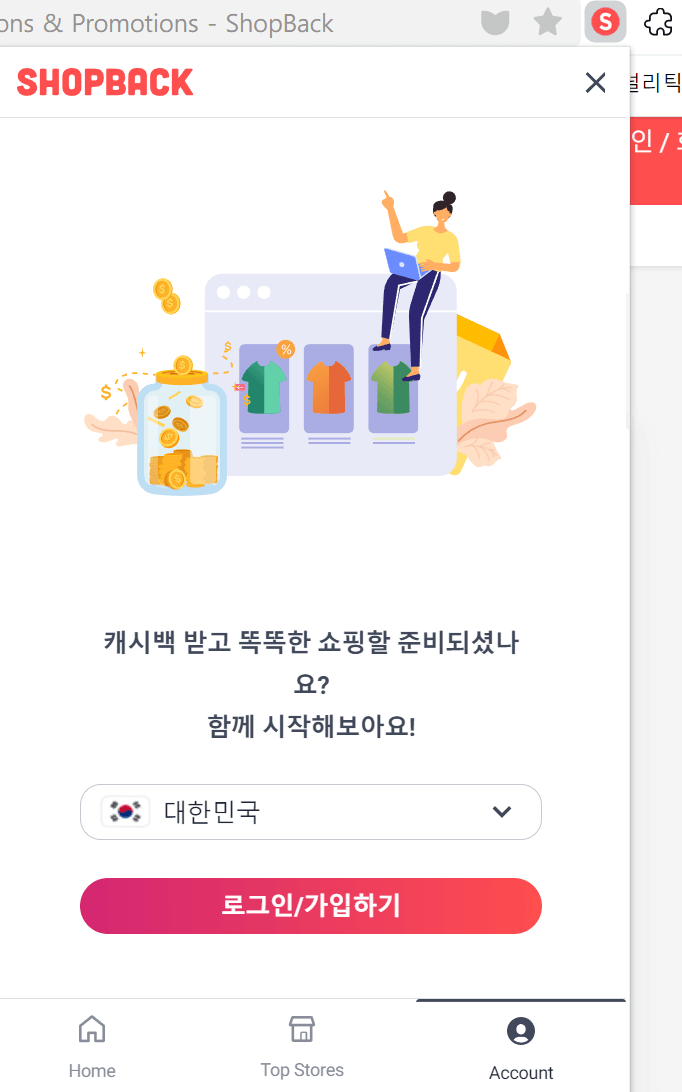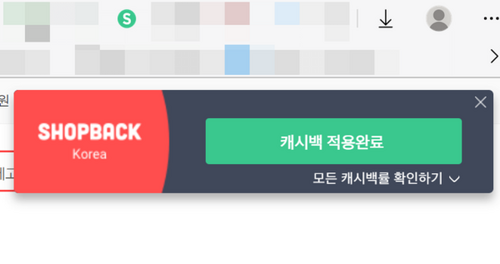 원하는 쇼핑 사이트에 들어가면 샵백 확장프로그램에서 자동으로 인식하여 캐시백 가능한 사이트면 브라우저 우측 상단에 사진과 같이 캐시백 버튼이 뜹니다. 해당 버튼을 눌러줍니다.