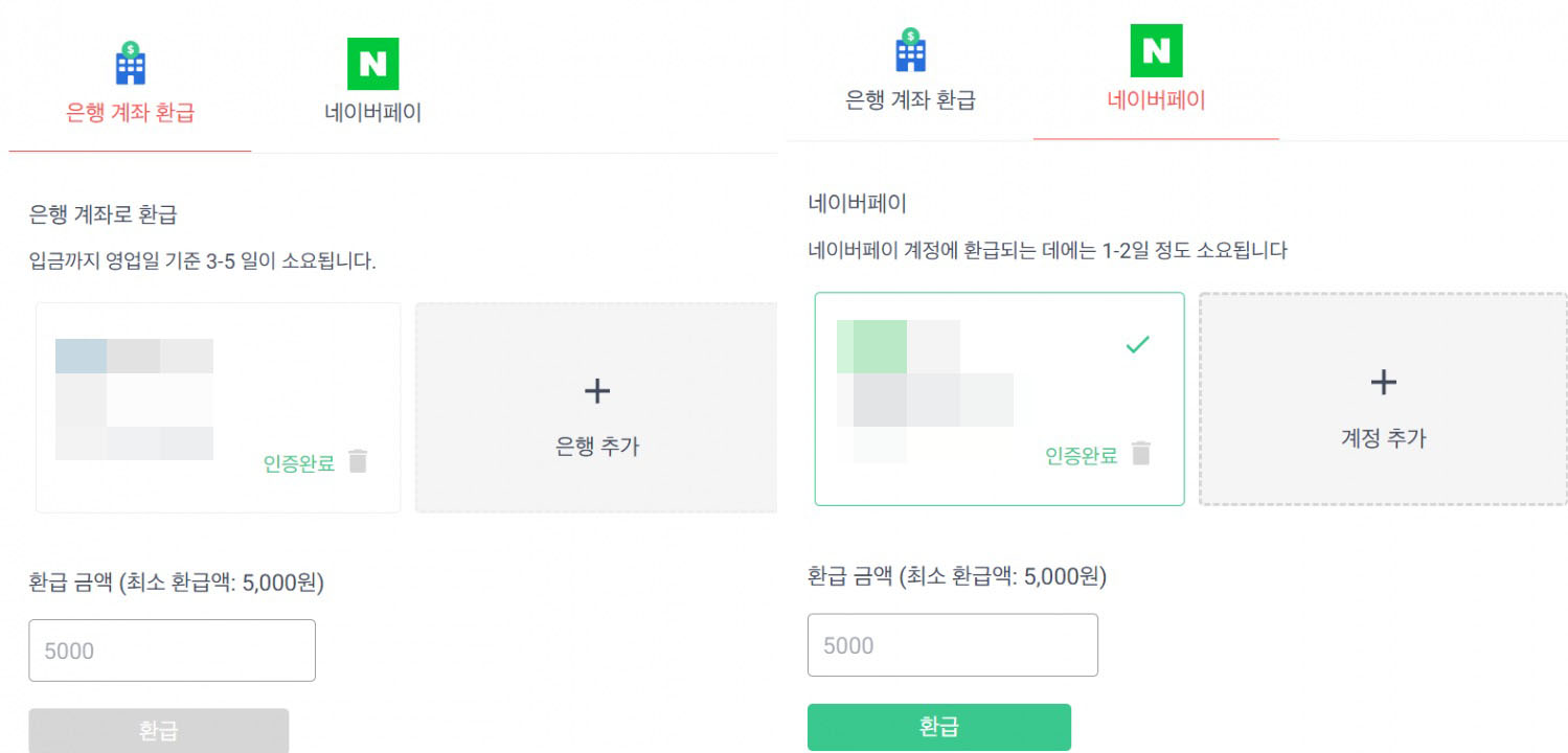 - 적립금으로 계좌 또는 네이버 페이 포인트등으로 환급 가능