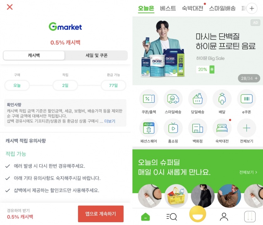 방문사이트가 G마켓이라면 G마켓을 터치하고 아래의 "ㅇㅇㅇ으로 계속하기" 버튼을 누르면 경유가 시작됩니다. 주문하시면 앱의 알림으로 알려줍니다. 참고로 G마켓처럼 앱을 통해서도 적립이 되는 경우가 있지만, 반드시 사이트를 통해야만 적립이 되는 경우가 있으므로 캐시백 적립 유의사항을 꼭 체크하시는것이 좋습니다.