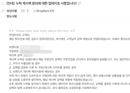 간혹 제대로 된 경유를 통했어도 캐시백으로 인정되지 않는 경우가 있습니다. 아예 캐시백 적립 상태에 뜨지 않거나 "승인 거절" 상태가 될 때인데, 이런 경우 샵백 측에 이의제기를 할 수 있습니다. 저도 작년에 이런 경우가 한번 있어서 이의제기한 적이 있습니다.