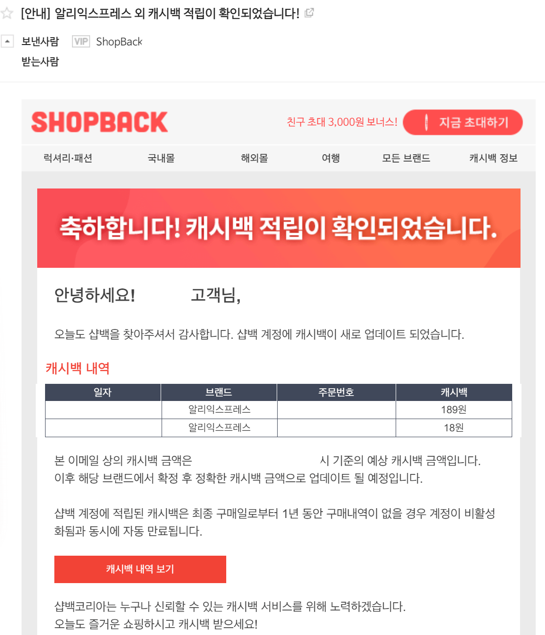 위의 과정을 통해 구매하시면 캐시백이 되는데, 캐시백 적립 확인이 실시간으로 되지는 않습니다. 빠르면 몇시간 뒤에 뜨고 보통은 하루 정도 뒤에 캐시백 확인을 할 수 있습니다. 위의 사진과 같이 기본적으로 캐시백 적립 확인이 되면 이메일로 캐시백 확인 메일이 옵니다. 또는 샵백 사이트의 캐시백 정보에서 확인할 수 있고 스마트폰 앱을 설치해뒀으면 앱 알림으로 알려줍니다.