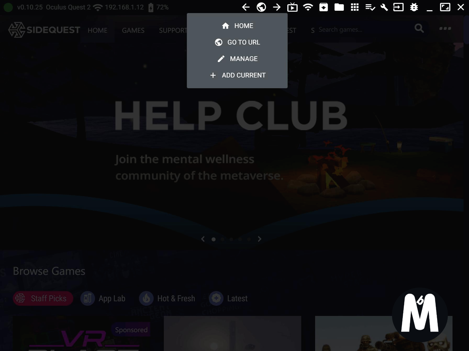 퀘스트2 기기와 컴퓨터를 연결하신 후, 사이드퀘스트 프로그램을 실행시켜 줍니다. 프로그램 상단의 지구본 모양을 클릭하면 위의 사진과 같이 목록이 뜨는데 "GO TO URL" 버튼을 클릭해줍니다.