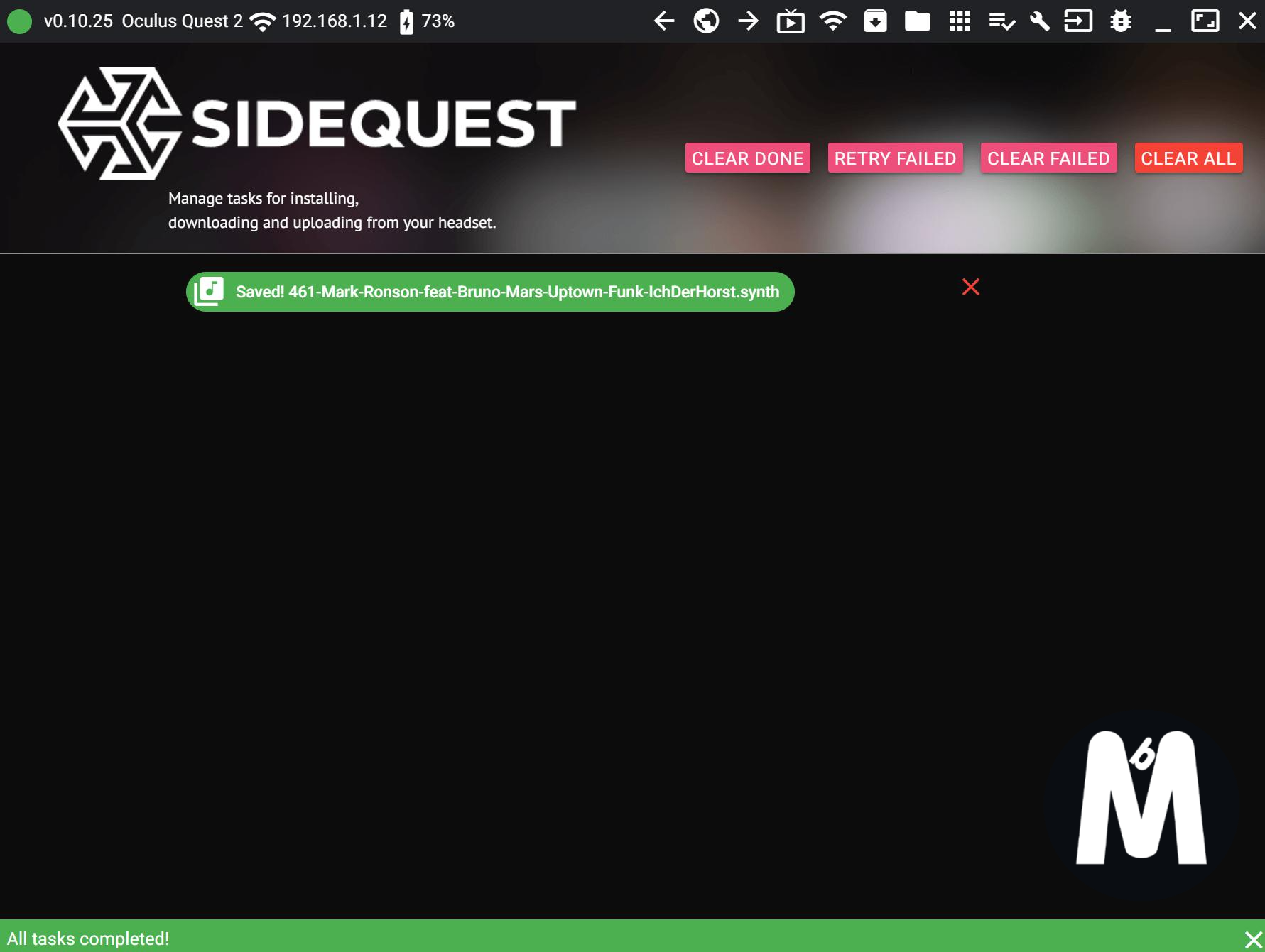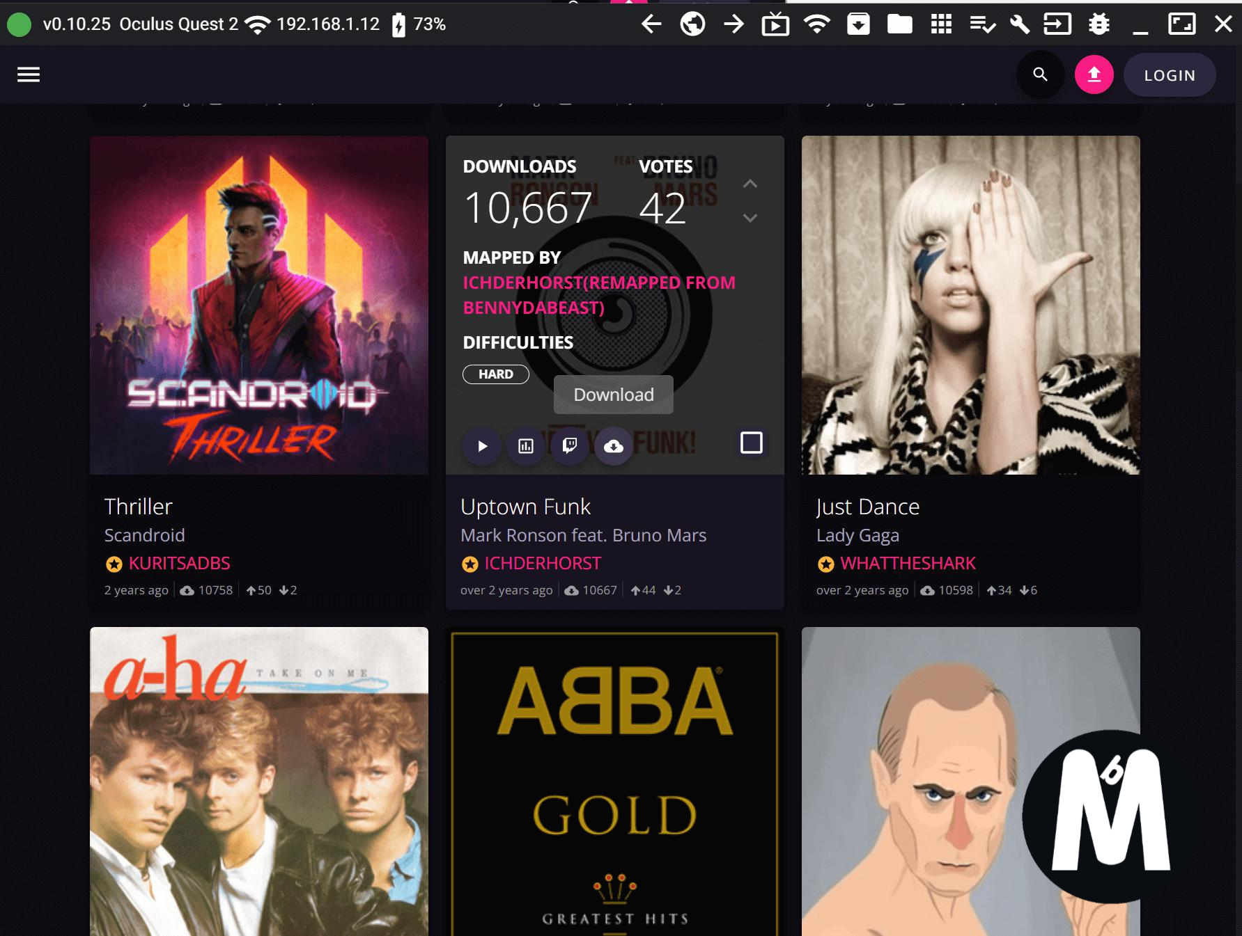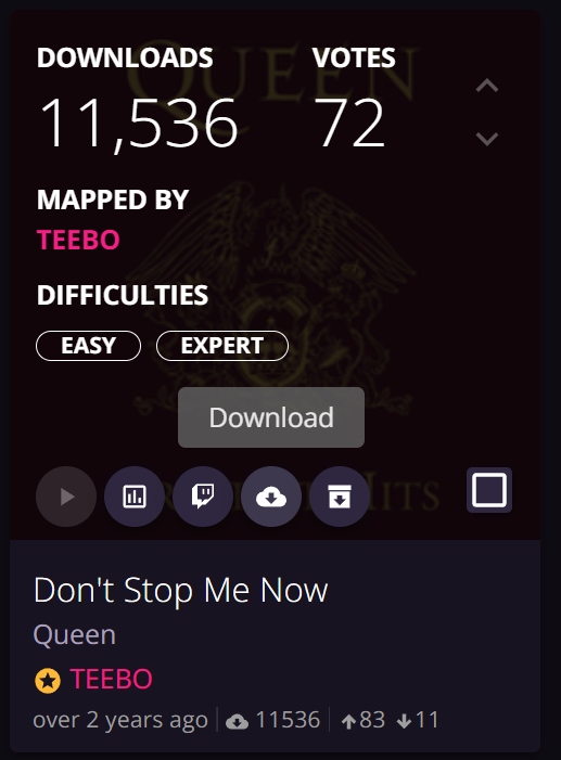 노래 다운로드는 마우스 커서를 표지에 갖다 놓으면 사진과 같이 해당 노래에 대한 정보가 뜨는데 "구름 모양"으로 된 버튼을 누르시면 다운로드가 진행됩니다. 확장자가 ".synth"인 파일이 받아질텐데요 이 파일을 그대로 퀘스트2 내부 폴더(아래 참고)에 넣어주시면 됩니다.