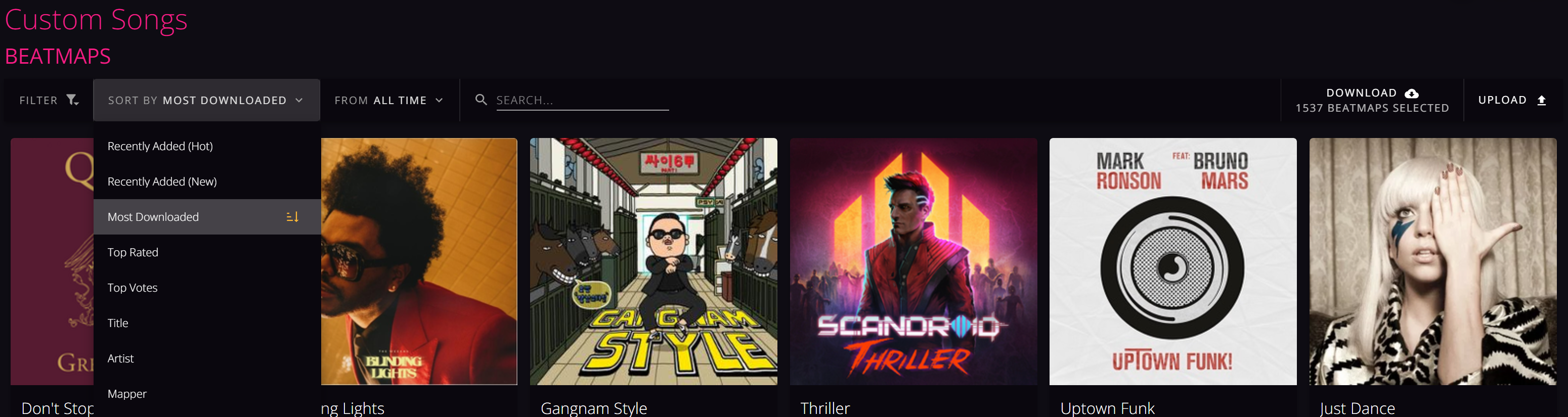 페이지로 들어가면 바로 보이는게 Custom Songs 카테고리인데요, 노래 표지 상단에 정렬(SORT BY) 및 검색 기능을 활용하셔서 원하시는 노래를 다운받으시면 됩니다. 사진의 맨 오른쪽에 보이는 DOWNLOAD 버튼을 누르면 현재 업로드 되어있는 모든 노래를 다운로드 받으실 수 있습니다. 8GB 이상으로 제법 용량이 큽니다.