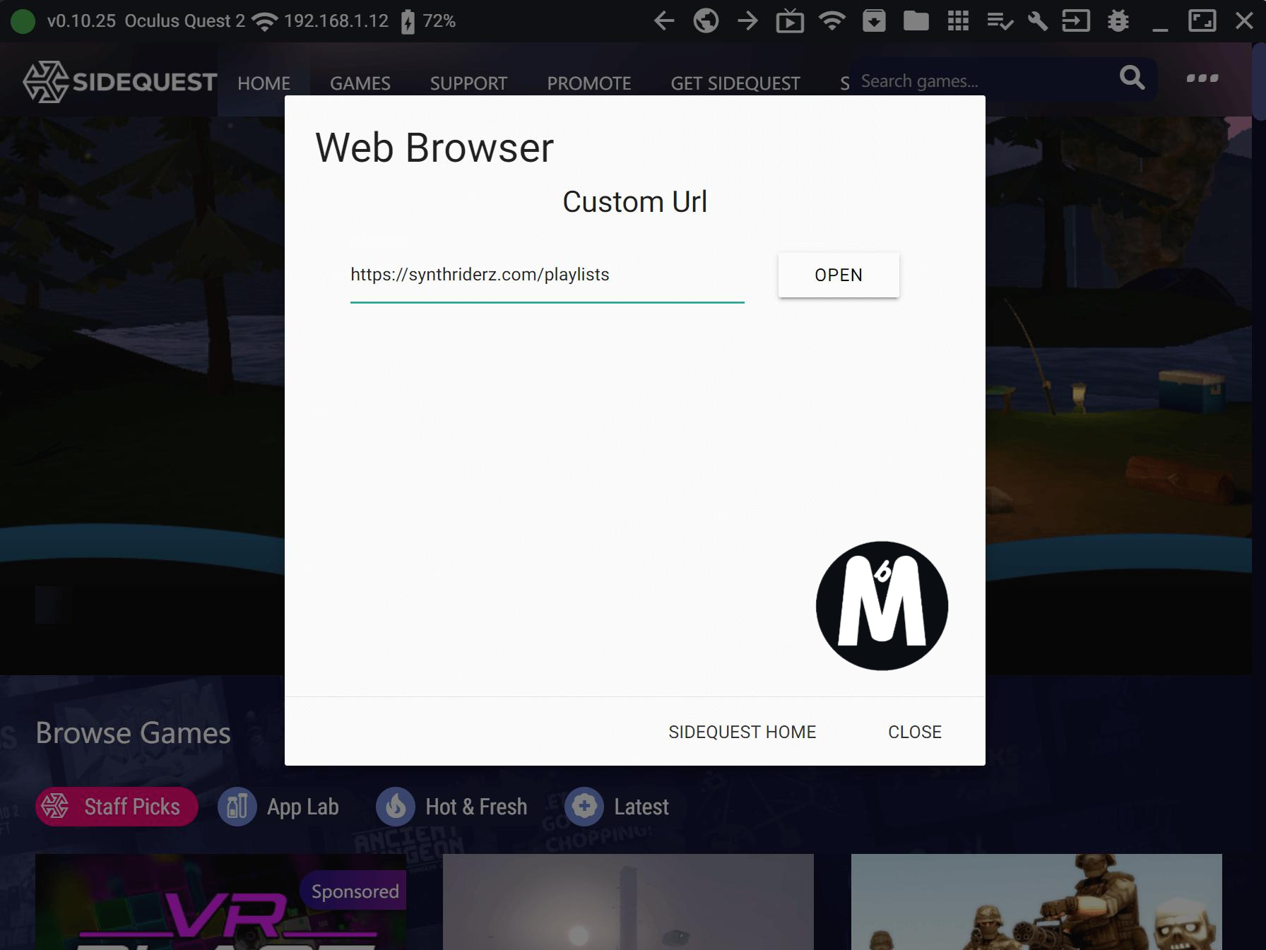 URL 입력 창이 하나 뜨는데, 여기에 신스라이더 커스텀곡 사이트 주소(https://synthriderz.com/beatmaps)를 입력해줍니다. 그리고 옆의 OPEN 버튼을 누르면 해당 페이지로 이동됩니다. 이제 여기서 커스텀곡을 다운받으면 퀘스트2 내장 메모리의 신스라이더 커스텀곡 폴더로 다운로드 됩니다.