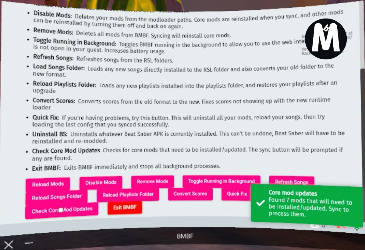이제 BMBF 앱 우측 상단에 있는 "Sync to Beat Saber" 버튼을 눌러 필수 코어 설치 및 몇가지 설정 등을 업데이트 해줍니다. (위의 사진과 같이 안내 창이 뜨고 업데이트가 다 되면 사라집니다.)