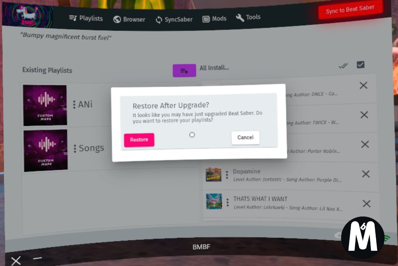 비트세이버가 새로운 버전으로 업그레이드 되었으나 아직 BMBF 코어 업데이트가 안된 경우 커스텀곡을 즐기시려면 코어 업데이트가 나올때까지 기다리시거나 이전버전으로 다운그레이드가 필요합니다.
