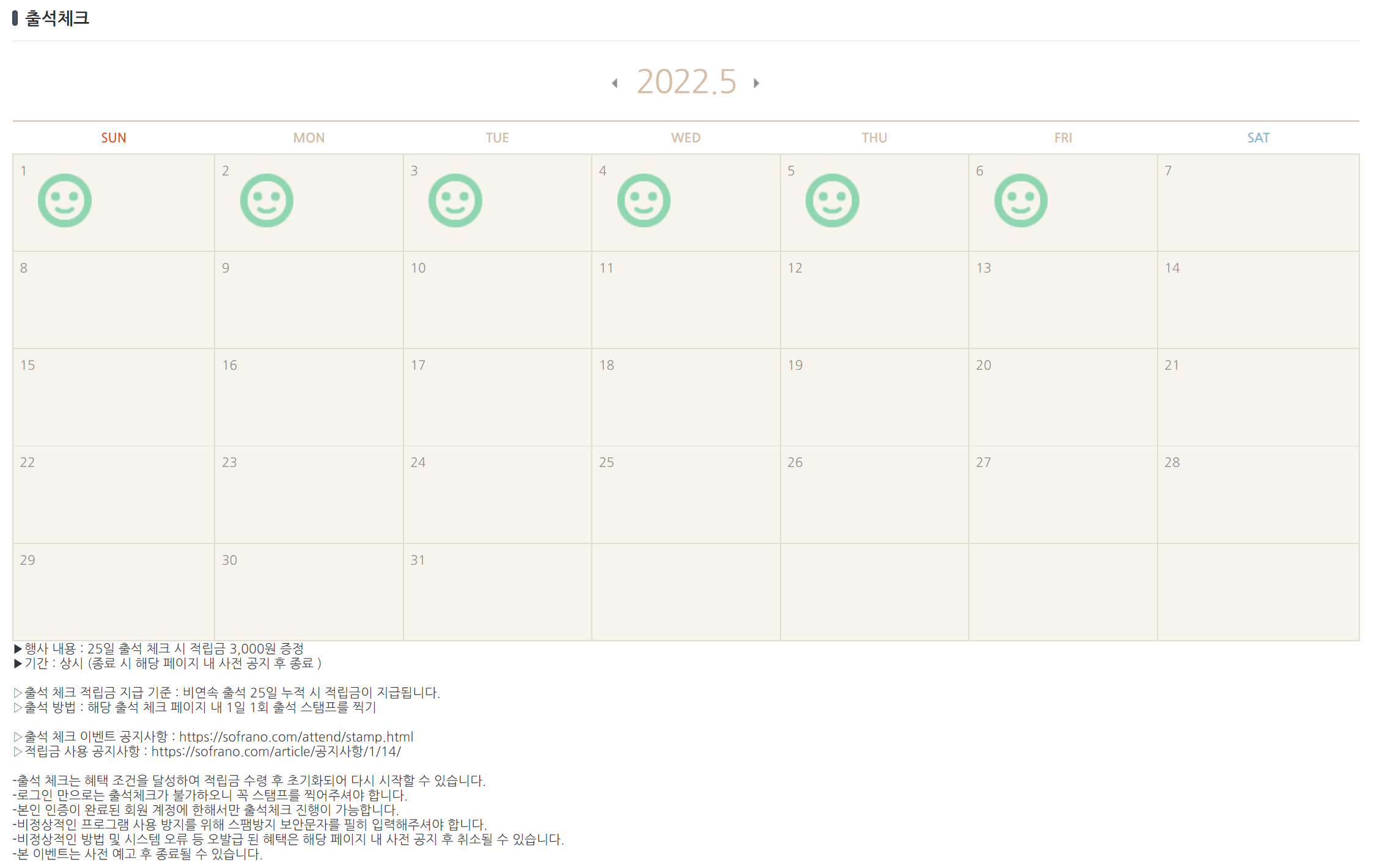 소프라노에서도 대원샵과 마찬가지로 하루에 한 번 출석체크로 적립금을 주는데 총 25일 출석체크 달성때마다 3,000포인트를 줍니다. 대원샵은 같은 기간 25일 출석체크하면 2,500포인트지만 소프라노는 여기에 500포인트를 더해주는 셈입니다.