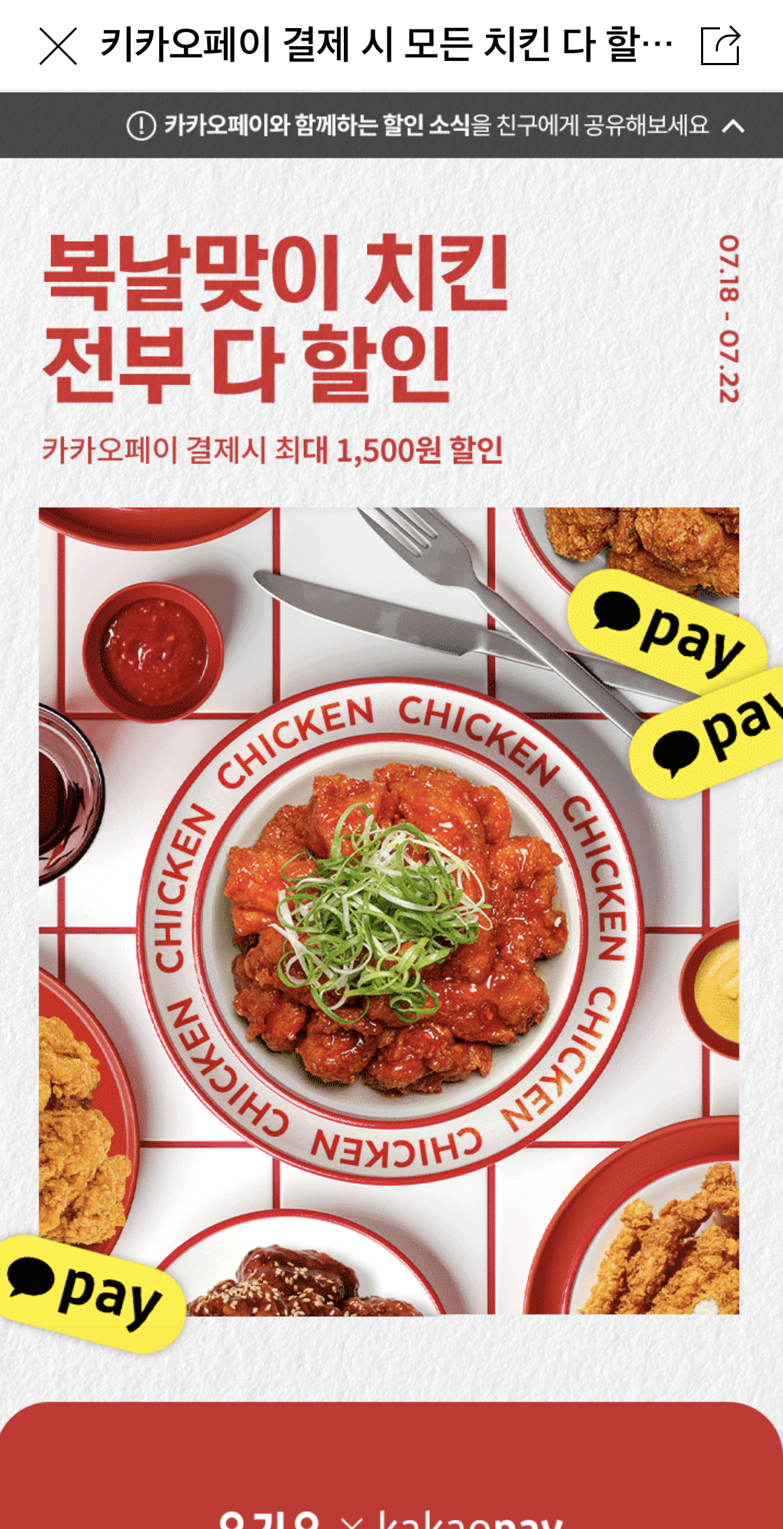 | 처갓집 | 7월 18일 (월) ~ 7월 24일(일) | 배달/포장 4천원 할인 | |