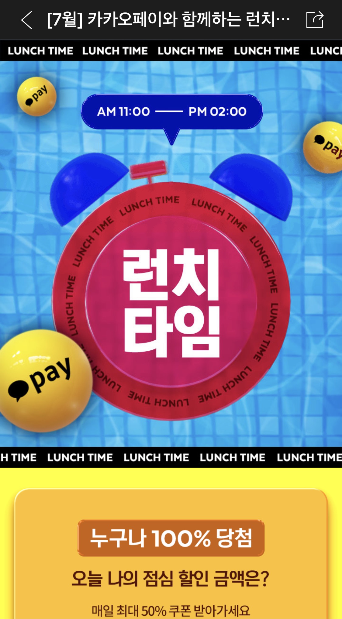 7월 25일 (월) 부터 7월 29일 (금) 까지 카카오페이와 함께 런치타임 행사를 진행합니다.