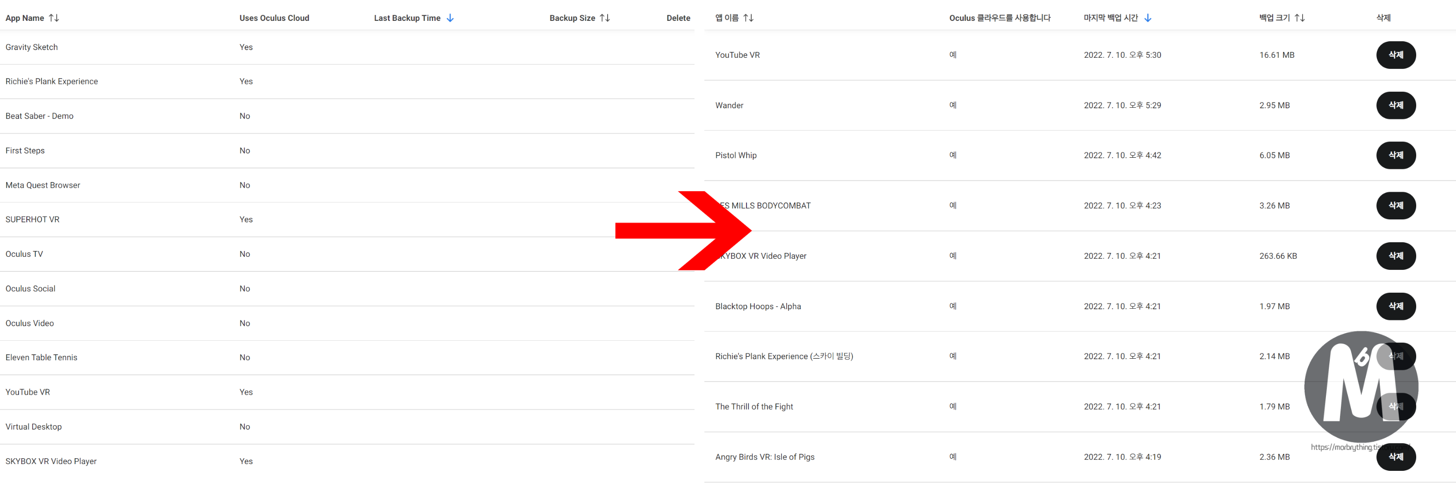 말 그대로 설치된 앱의 데이터를 오큘러스측 클라우드에 백업시켜놓는 기능으로, 기기 초기화나 기기 교체시 사용자 데이터를 쉽게 백업 및 복구할 수 있는 용도로 만들어졌는데요. (단, 지원되는 앱에 한해서 백업 가능)