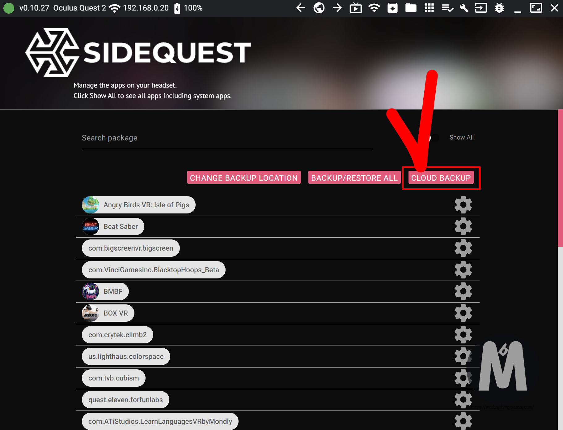 사이드퀘스트 버전 27부터 클라우드 백업을 수동으로 할 수 있는 기능이 추가 되었습니다. 위의 사진과 같이 퀘스트2 연결 후 앱 목록 메뉴에서 클라우드 백업 버튼을 누르면 진행이 됩니다.