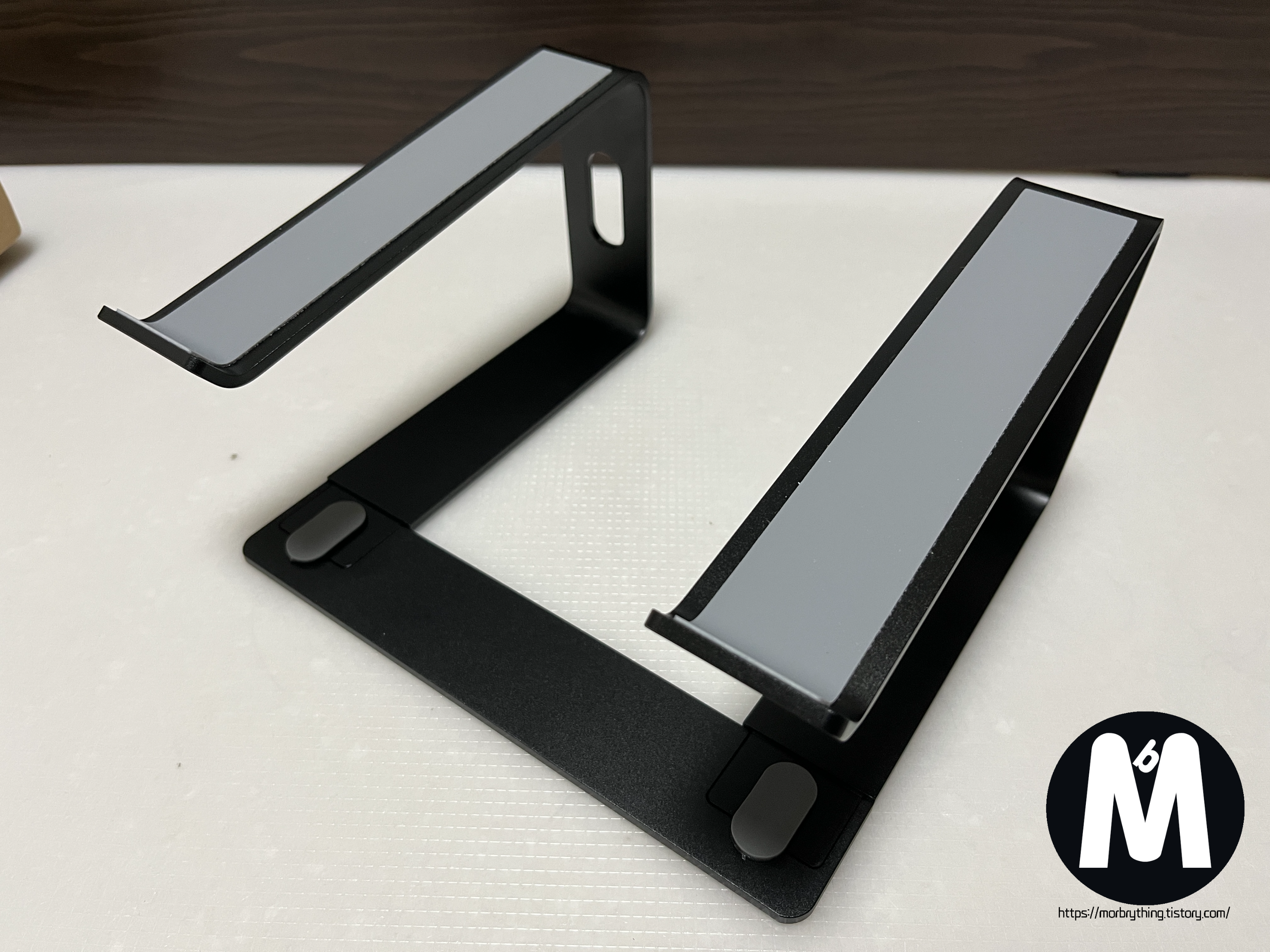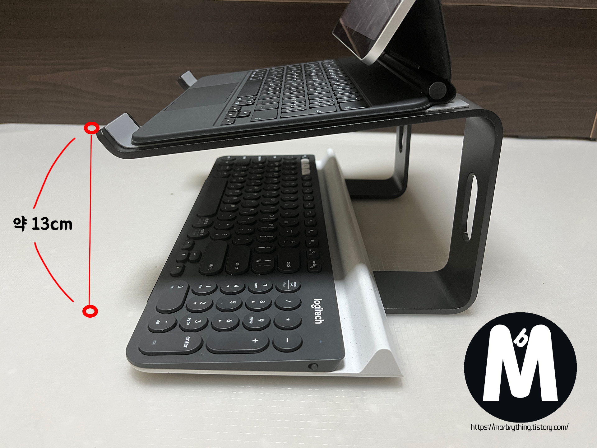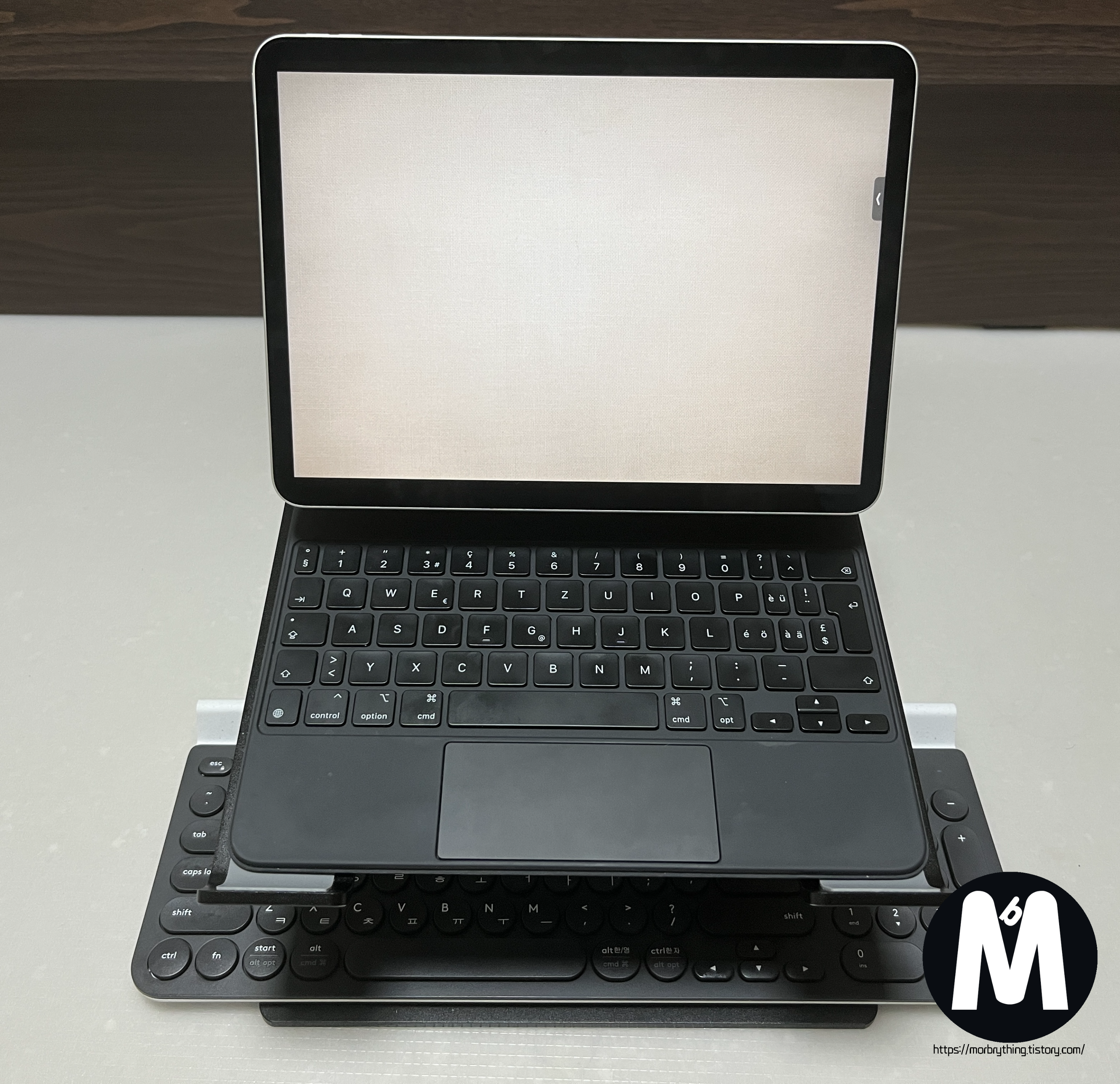 거치대에 한번 아이패드 + 매직키보드를 올려놓은 모습입니다. 일자로 되어있는게 아니라 각도가 살짝 아래로 내려가 있어 불편하지 않습니다. 거치대 자체 무게가 있어서 안정적으로 거치가 가능합니다.