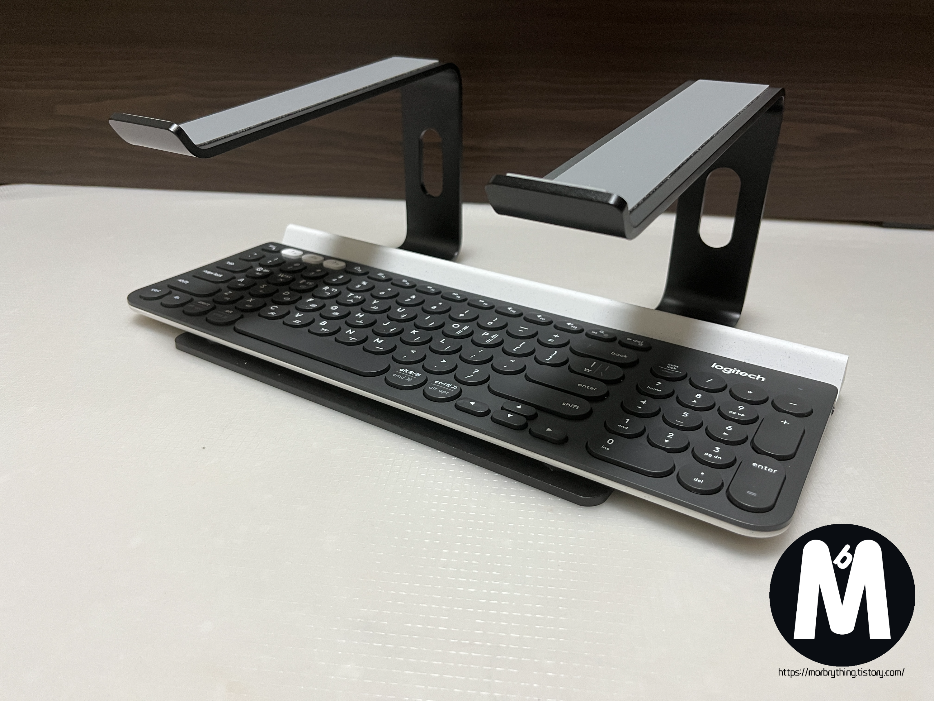 거치대 바닥 부분(1층)은 키보드를 거치해놓는 공간입니다. 2층 거치 공간은 1층 키보드 수납 공간과의 거리가 대략 13cm 정도로 되어있어 저 공간에 키보드를 놓고 써도 전혀 걸리적 거림이 없습니다.