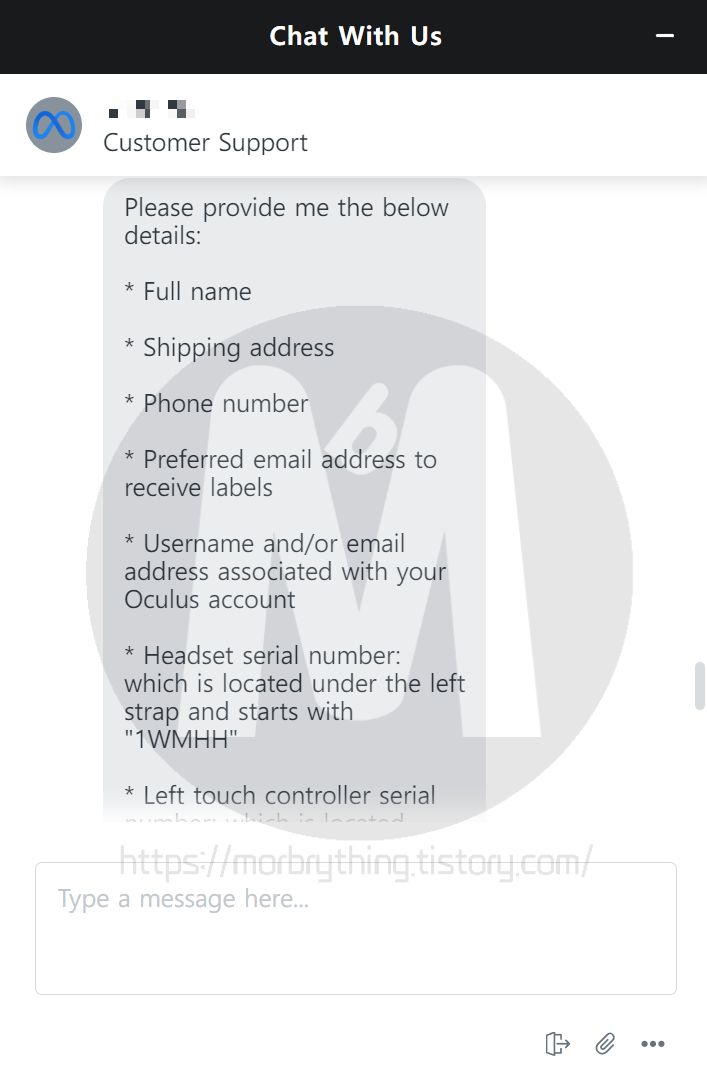 대략 20분 넘게 3가지 증상에 대해 이것저것 질문한 뒤, 위의 사진에 보이는대로 A/S를 위한 사용자 정보 및 기기 정보를 물어봤습니다.(이름, 배송받을 주소, 폰 번호, 이메일 주소, 오큘러스 계정, 기기 시리얼 번호) 작성해서 제출하니