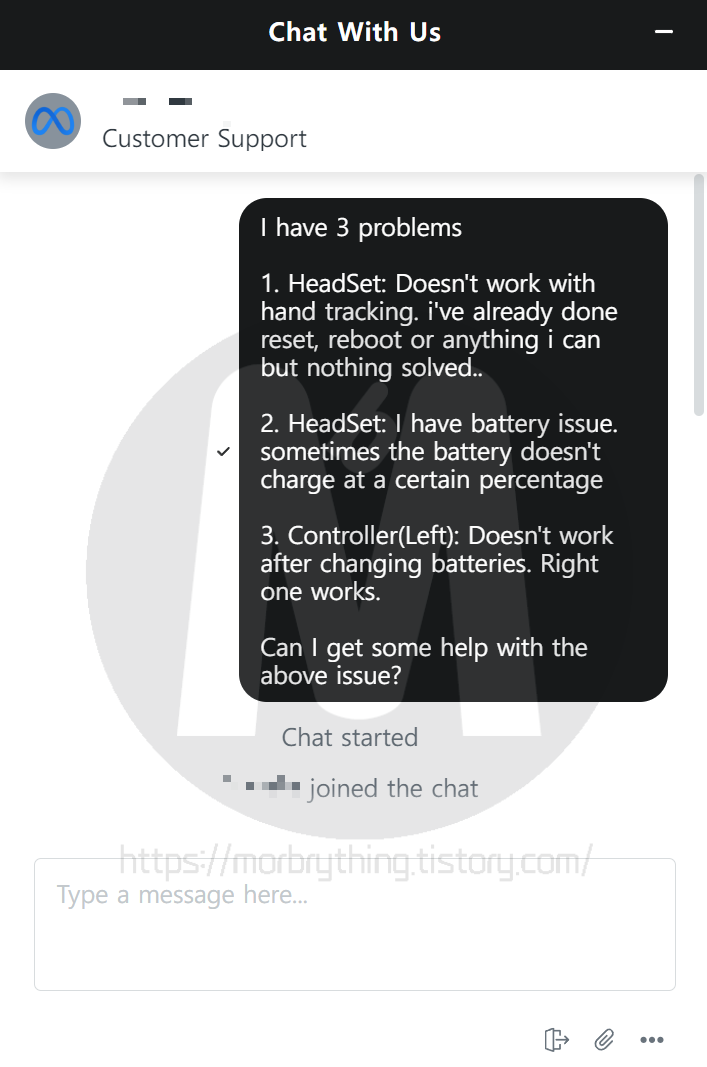 오큘러스 공식 홈페이지는 한국어 사이트의 경우 채팅상담을 지원하지 않기 때문에 이메일로만 문의해야 해서, 실시간 채팅상담이 가능한 영문 사이트를 통해 문의했습니다.