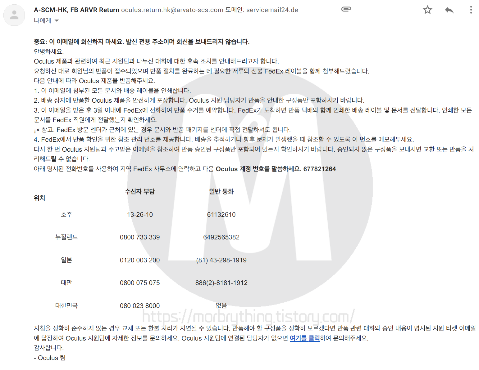 반품 픽업 예약은 오큘러스측에서 해주는게 아니라 고객이 직접 해야 하기 때문에 위의 메일을 참고하여 페덱스 쪽에 전화로 예약하면 됩니다. 다만 페덱스 전화번호가 바뀌어서 위에 적힌 번호가 아닌 1588-0588로 하셔야 합니다.