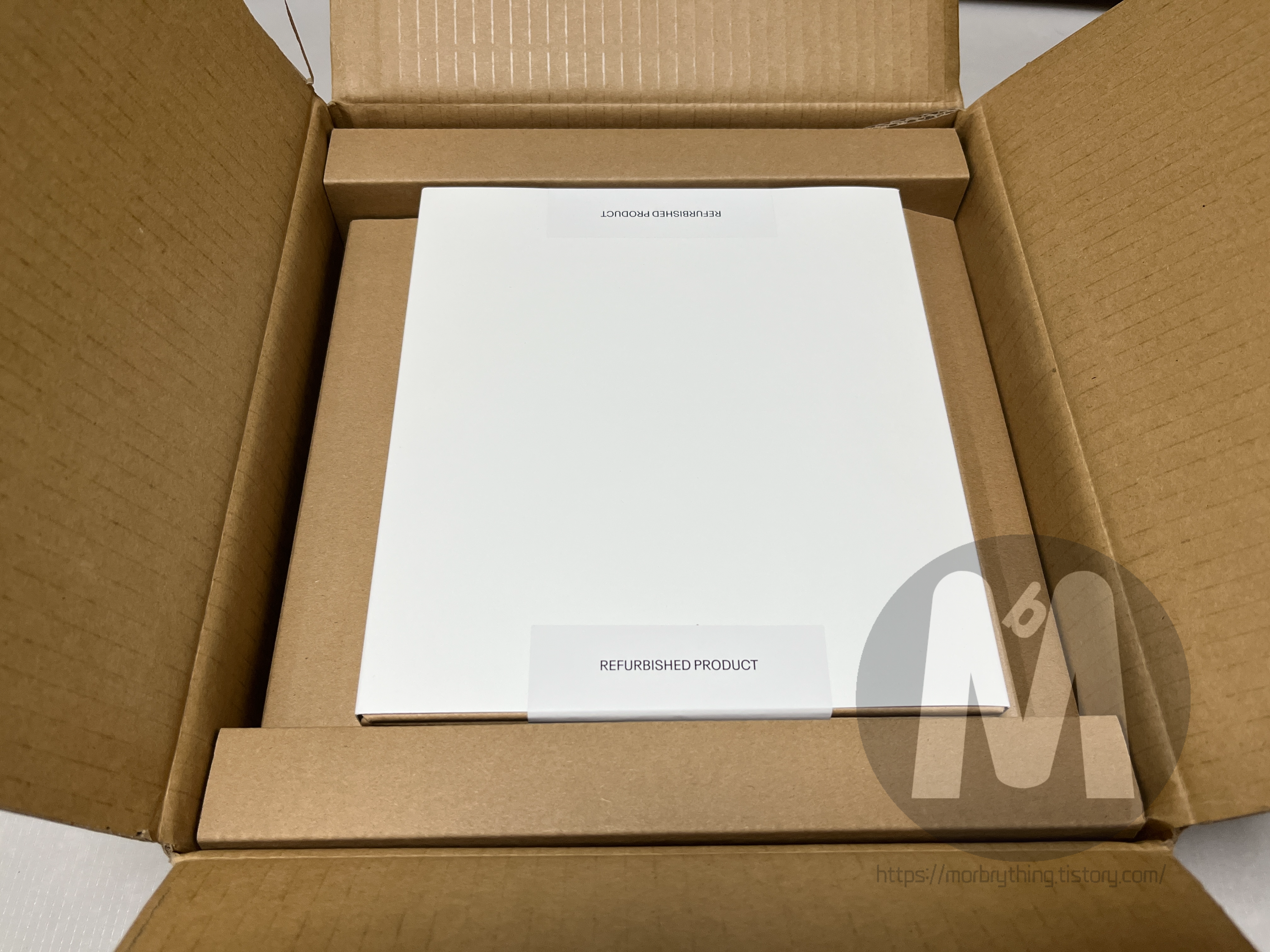 배송된 패키지 박스를 뜯어보면 견고하게 고정되어 있고 리퍼비쉬 제품임을 알려주는 라벨이 붙여져 있습니다. 아예 새제품이 아니기 때문에 새로운 제품으로 교체 받았다고 해도 리퍼럴 제도(36,000원 상당의 크레딧 받기) 이용은 불가능합니다.