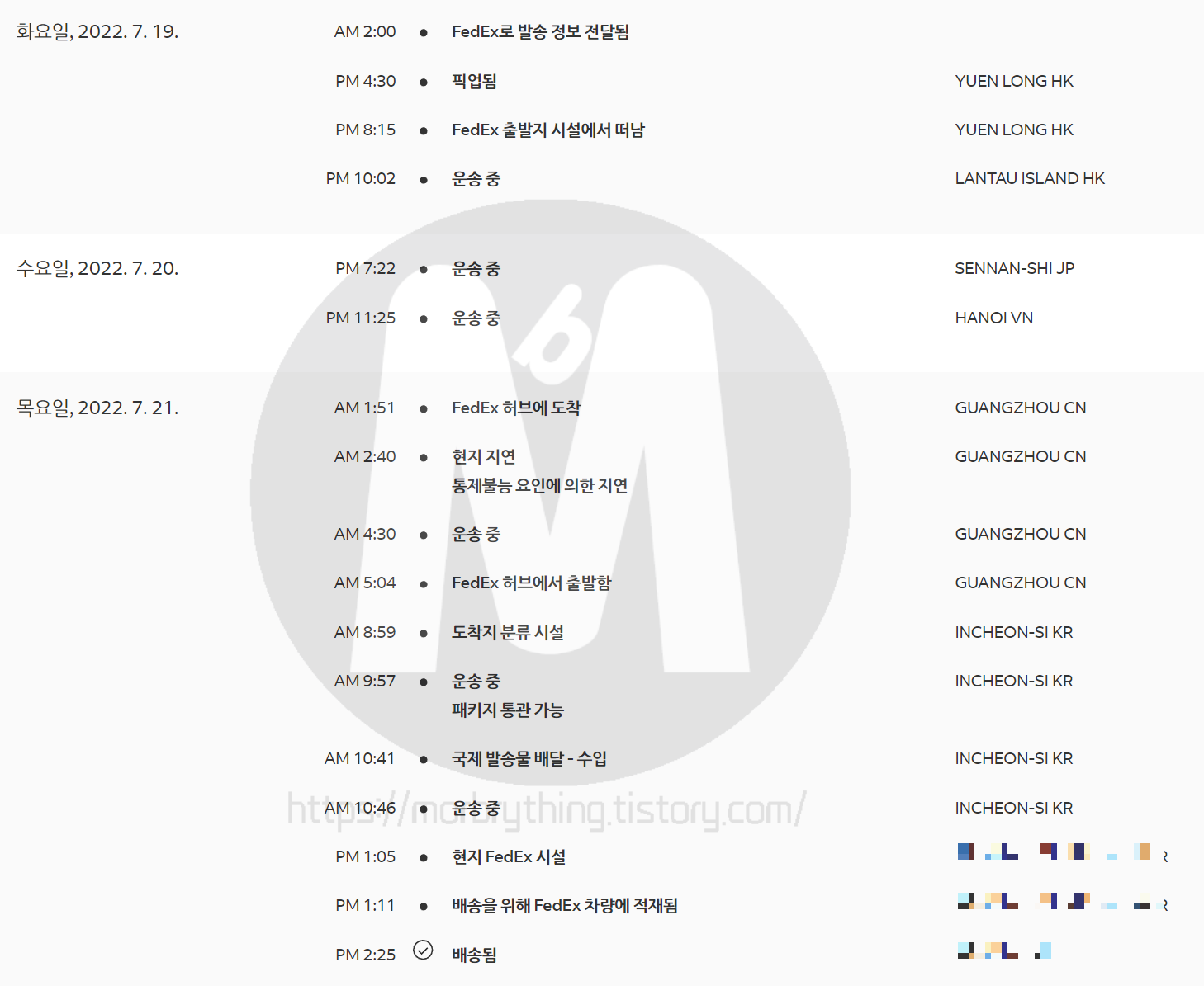 페덱스 기사님이 방문하여 물품을 수거해 가면 이제 홍콩까지 무사히 도착하길 기다리면 됩니다. 저의 경우 2일정도 걸렸고 다만 이후에 도착했다거나 진행 상황에 대한 안내 메세지가 없어서 결국 3일 뒤에 문의하게 되었습니다.