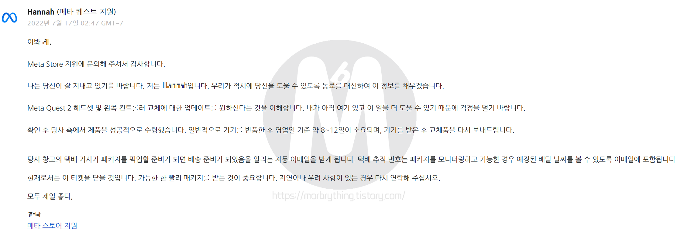 문의 결과, 제대로 잘 도착했고 8~12일 정도 소요될 수 있다는 답변을 받았습니다. 그래서 생각보다 오래 걸릴줄 알았는데 막상 바로 다음날 교체품을 발송했다는 메일을 받았습니다. (저의 경우 발송 전 영문 주소가 잘못됐다고 나와서 메타측에 메일을 보내 수정하느라 하루 정도 더 지연되었네요)