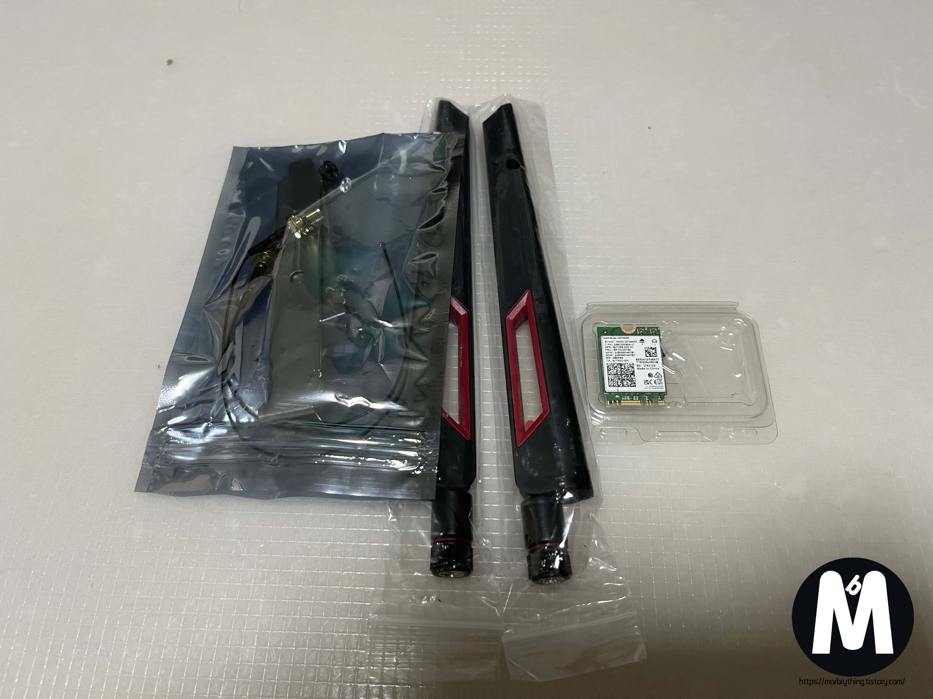 종이 패키지에 담겨 무사히 우체국으로 배송 받았습니다. 인텔 AX210 무선랜카드와 10DBI 안테나, 그리고 케이블 및 데스크탑용 안테나 지지대가 구성품입니다.