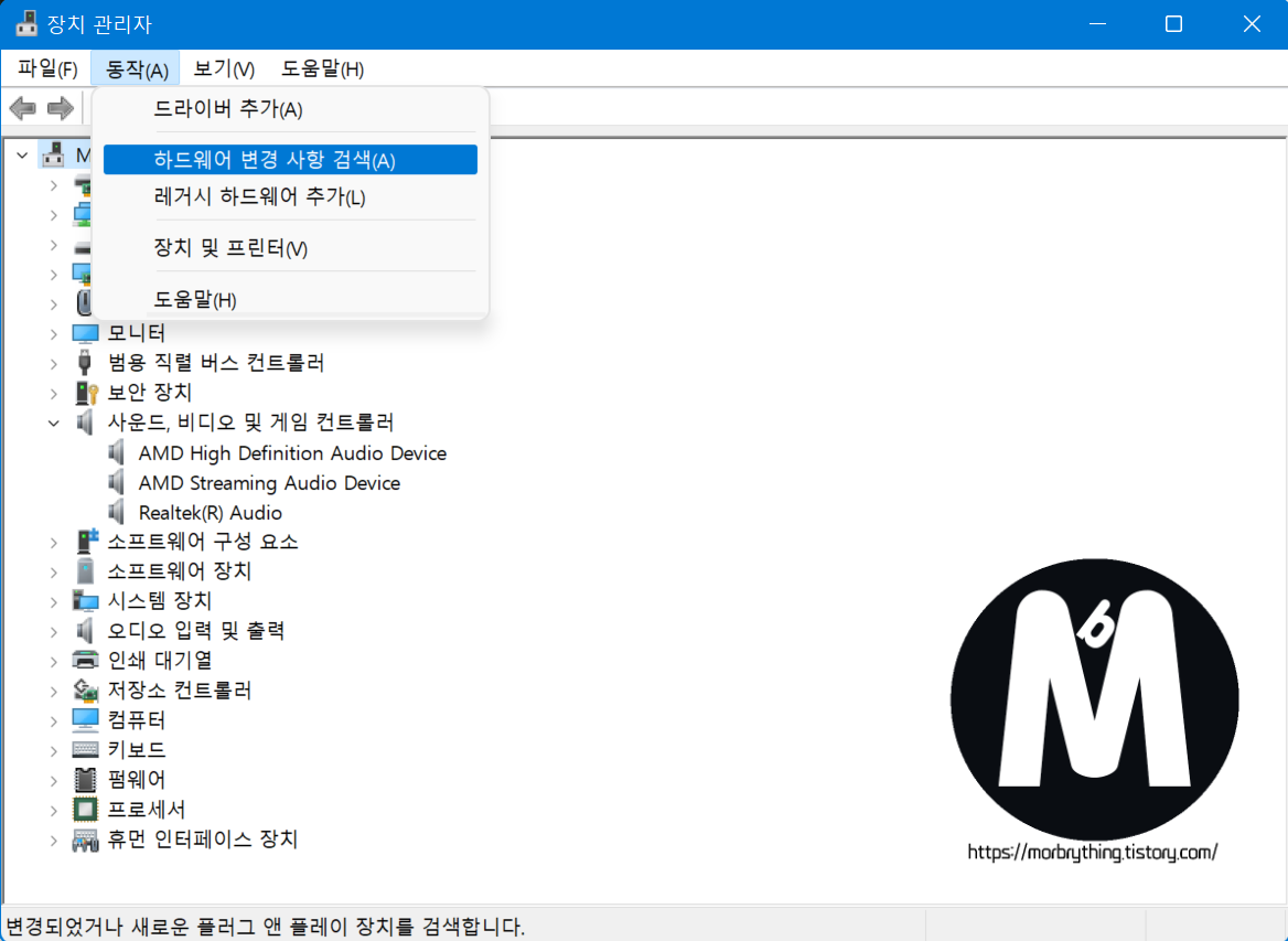 장치 관리자의 동작 메뉴 > 하드웨어 변경 사항 검색 버튼을 클릭해줍니다. 다시 해당 블루투스 드라이버가 설치되면서 오류가 나타나지 않을겁니다. 만약 이렇게 해도 해결이 안된다면 드라이버를 다시 완전히 지웠다가 재부팅 후 드라이버를 재설치해보시기 바랍니다.