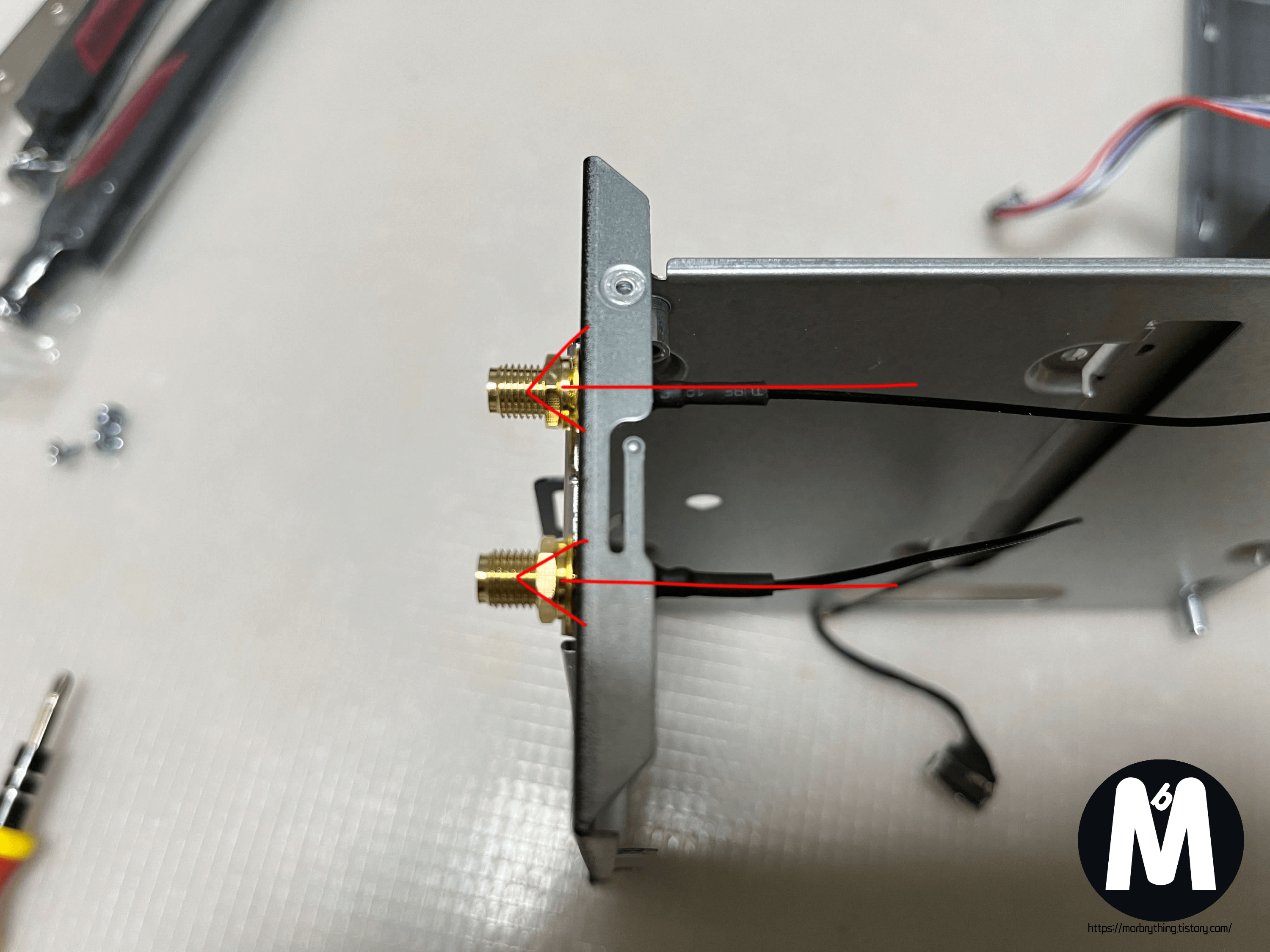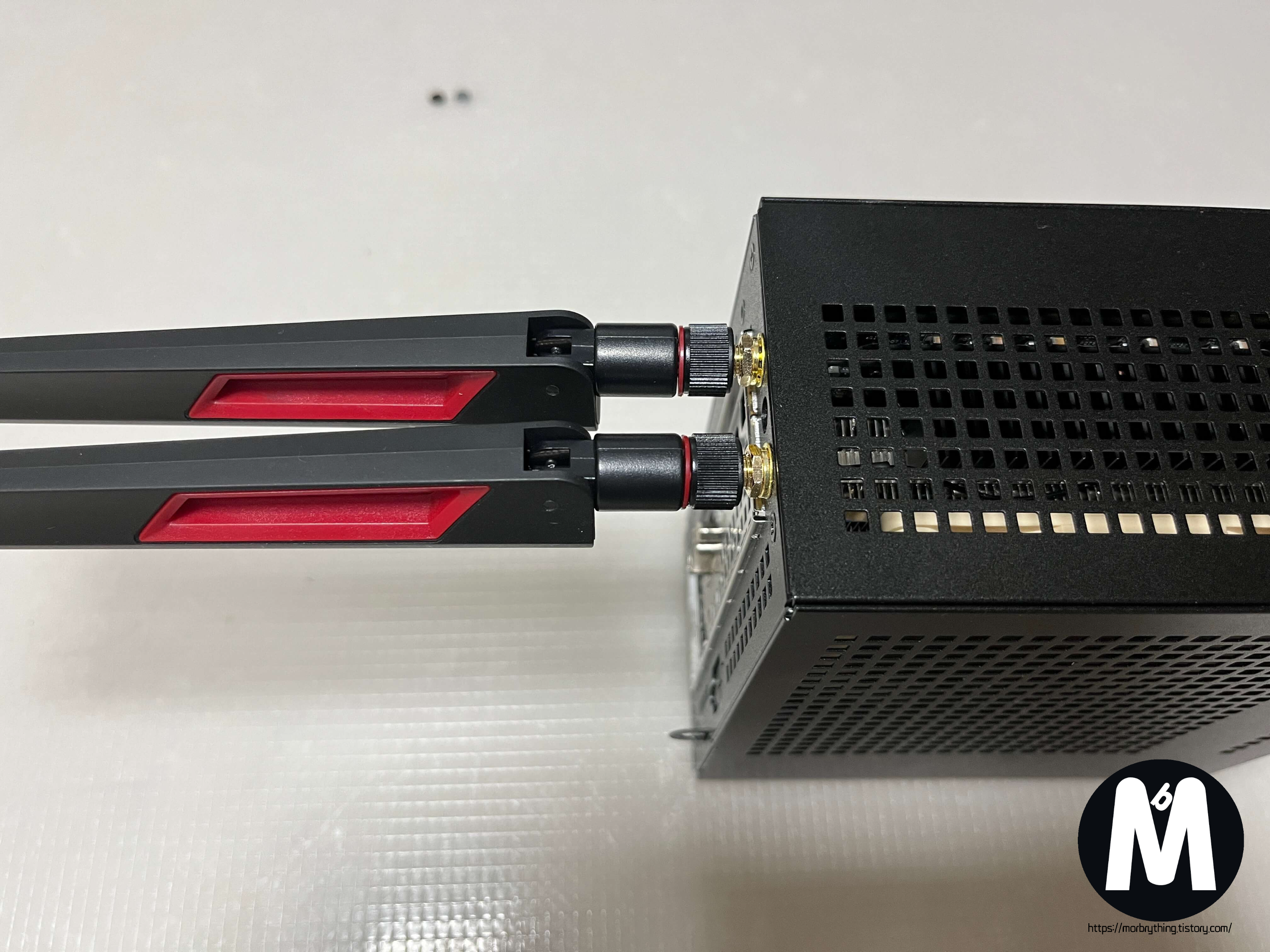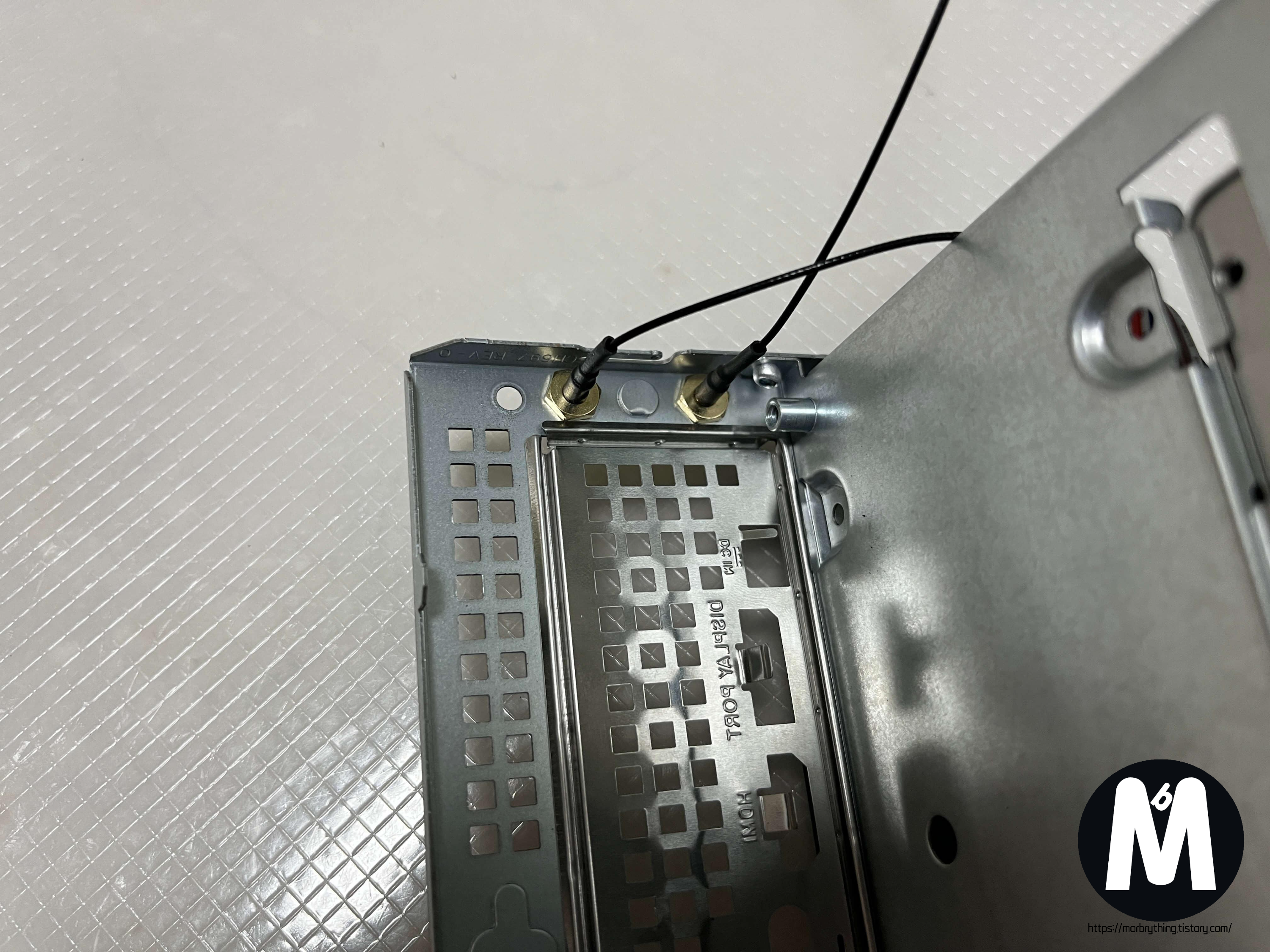AX210 무선랜카드가 담겨있는 패키지를 보면 사진과 같이 안테나 케이블이 뽑아지는걸 방지해주는 캡이 있습니다. 마지막으로 이걸 사진과 같이 꽂아주시면 내부 조립은 완성됩니다.