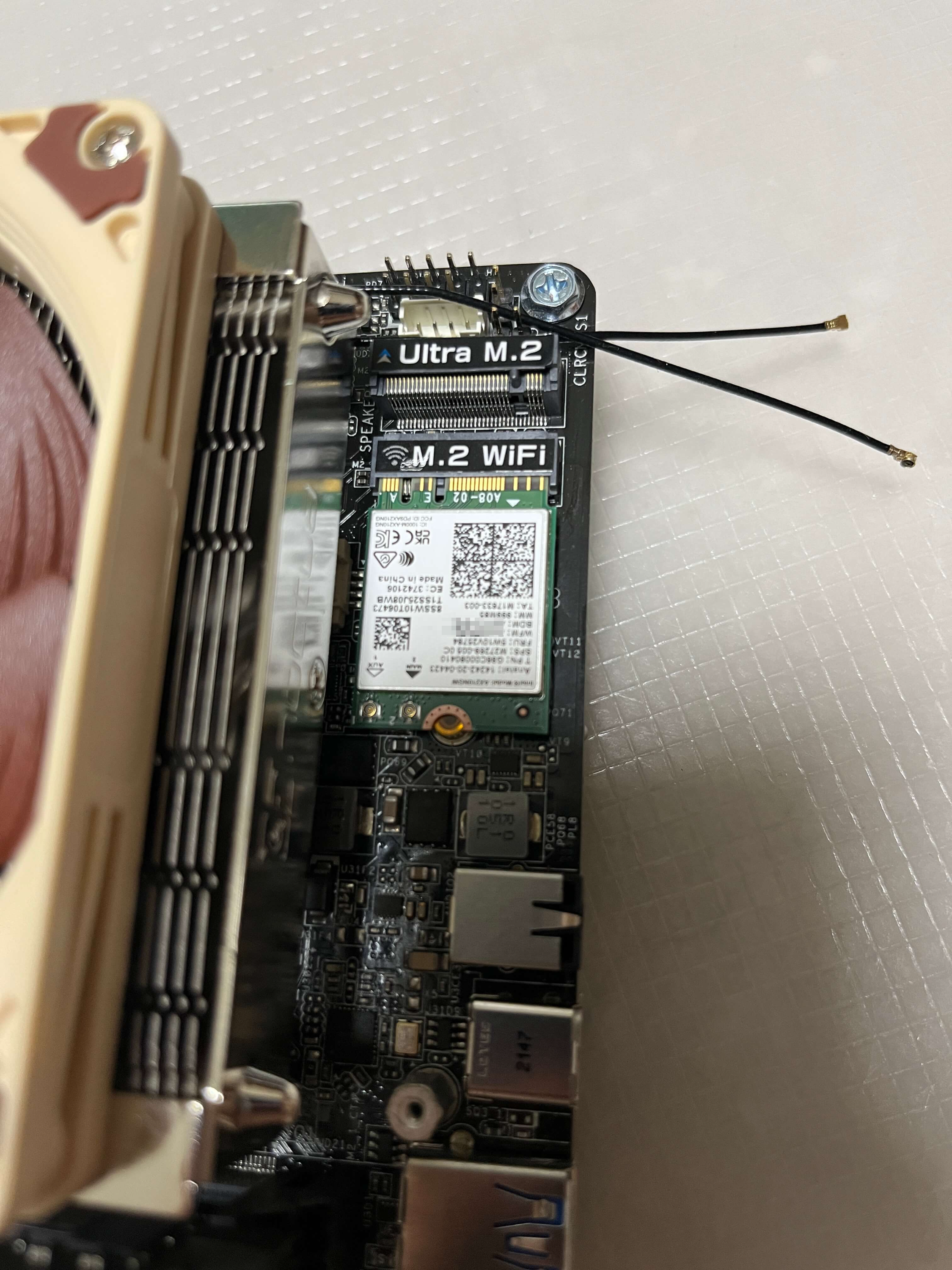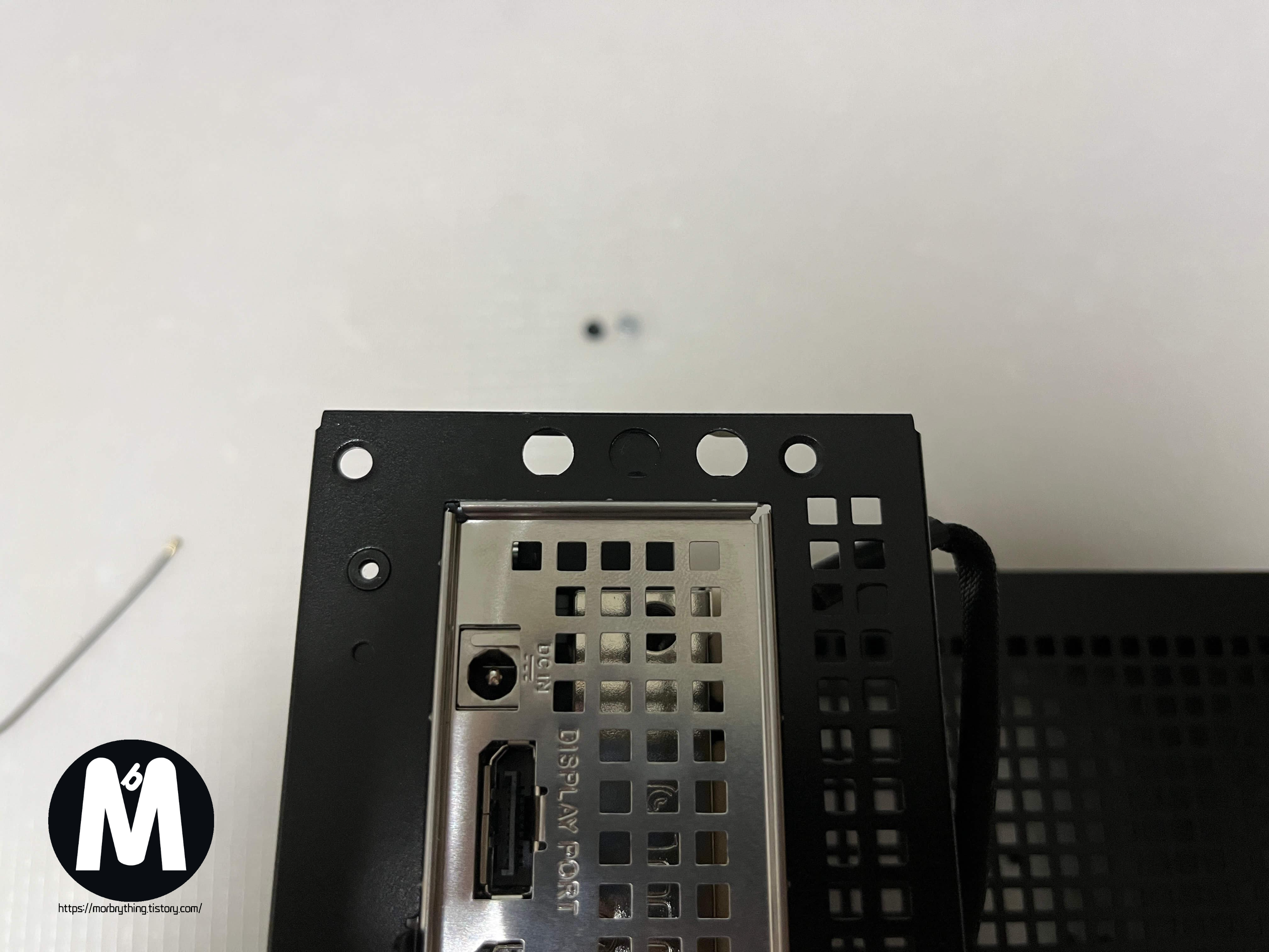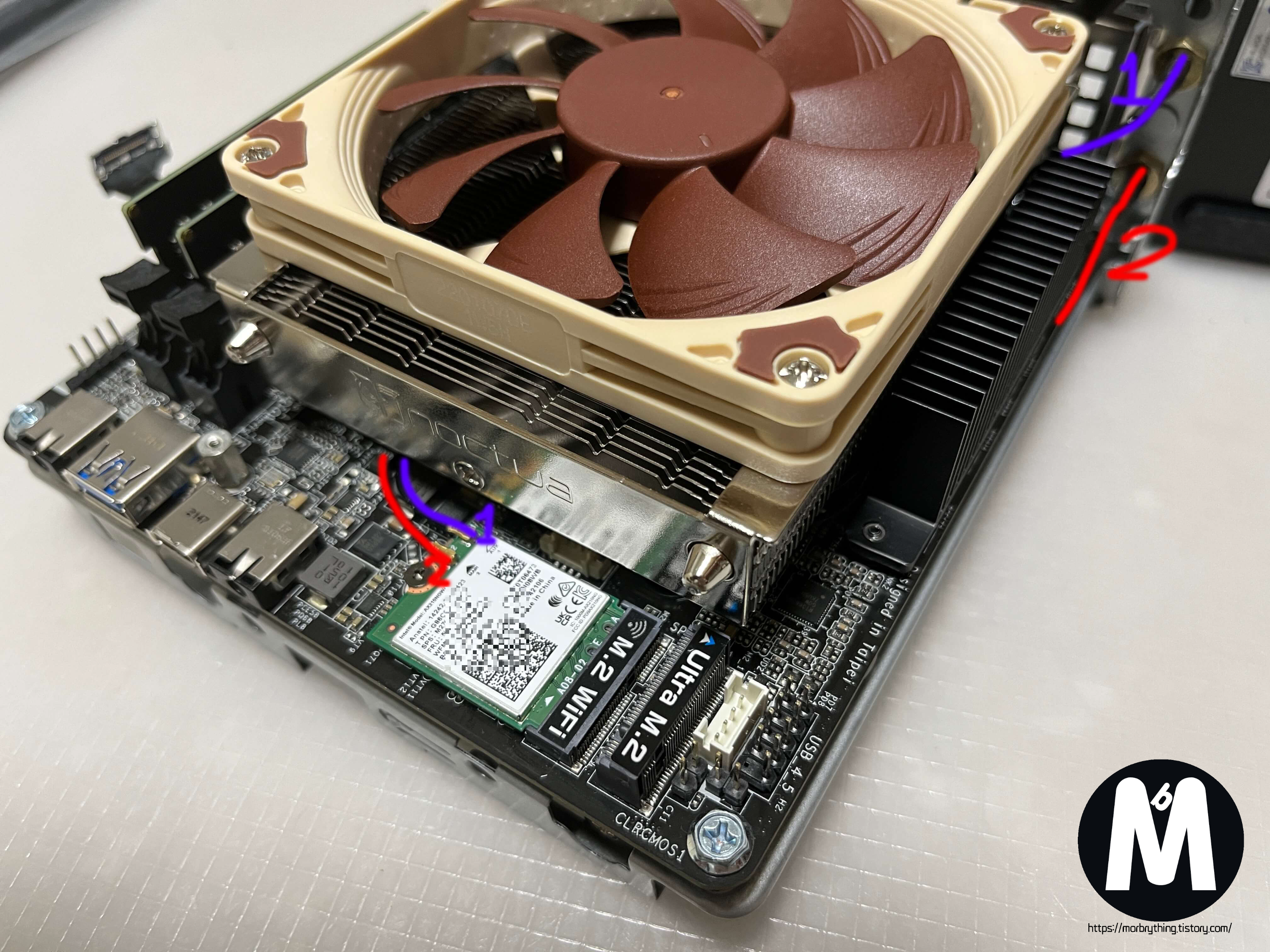 AX210 무선랜카드가 담겨있는 패키지를 보면 사진과 같이 안테나 케이블이 뽑아지는걸 방지해주는 캡이 있습니다. 마지막으로 이걸 사진과 같이 꽂아주시면 내부 조립은 완성됩니다.