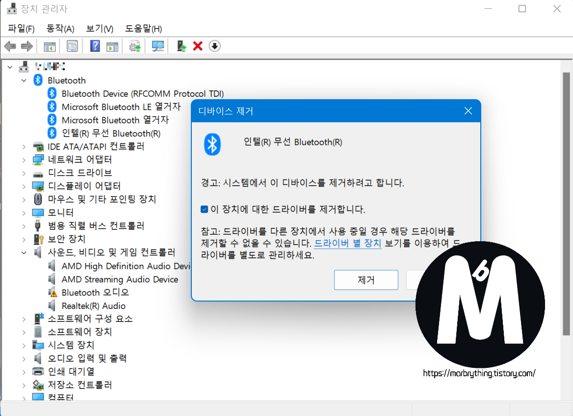 먼저 장치 관리자(시작버튼 오른쪽 마우스)에 들어가 "Bluetooth" 메뉴에 있는 "인텔 무선 Bluetooth" 항목에서 디바이스 제거 (드라이버 포함 제거)를 클릭해 제거해줍니다. 그러면 해당 Bluetooth 항목이 사라지는데,