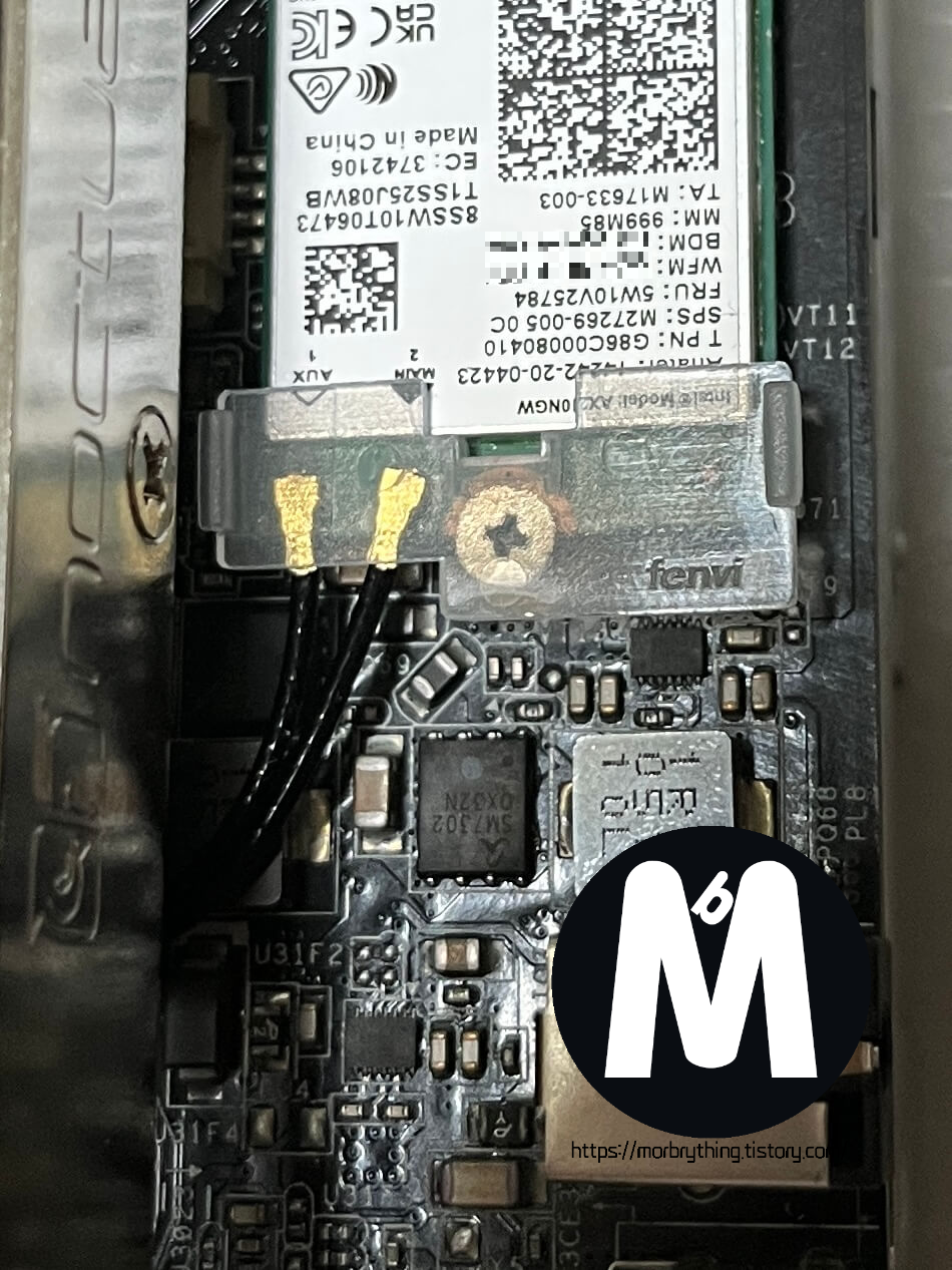 안테나 케이블을 꽂았으면 AX210 무선랜 카드를 메인보드에 꽂아줄 차례입니다. X300에서는 SSD용 M.2 슬롯 바로 아래에 무선랜카드용 M.2 슬롯이 있습니다. 여기에 바로 꽂은다음 동봉된 나사로 조여줍니다.