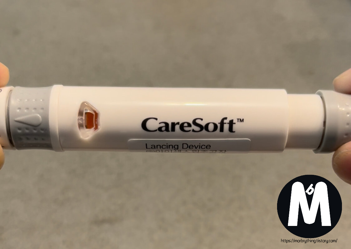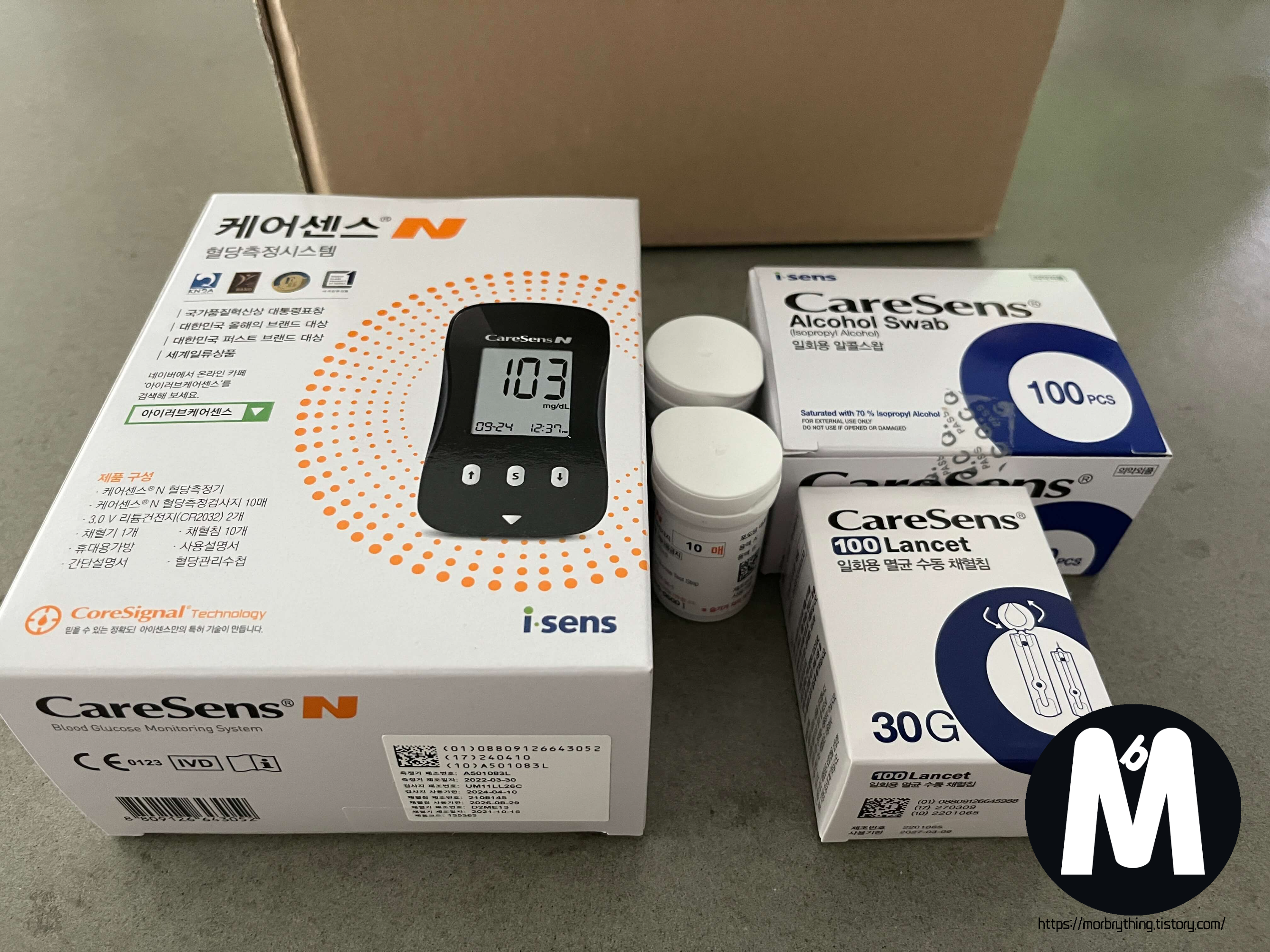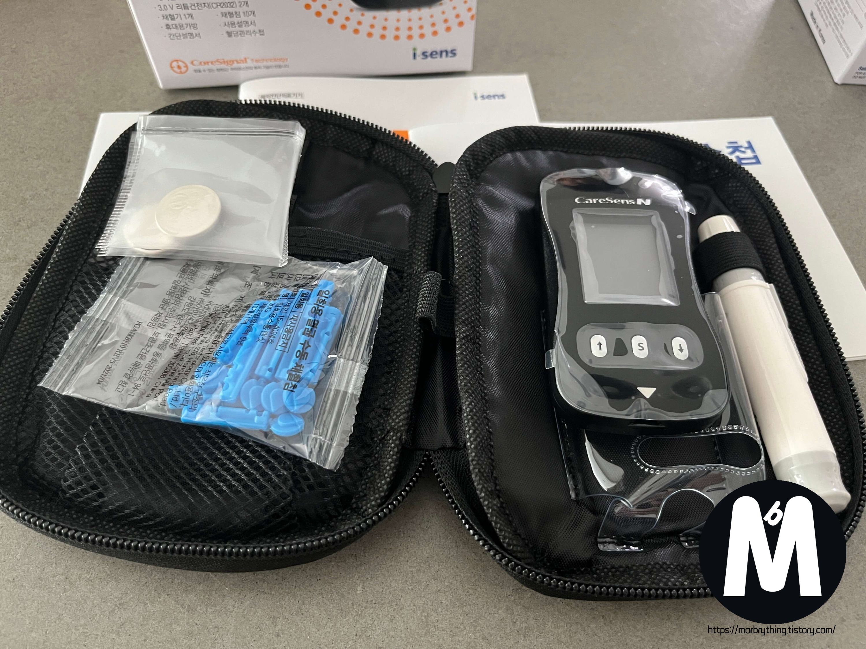 혈당기는 아이러브사와 함께 진행하는 캠페인이기 때문에 케어센스 N 제품(모델명: GM505PAD)으로 보내줍니다. 혈당기만 보내주는게 아니라 측정에 필요한 일회용 채혈침 100개와 일회용 알콜 스왑 100개, 그리고 혈당측정 검사지 2통(1통당 10개)까지 챙겨주네요 :)