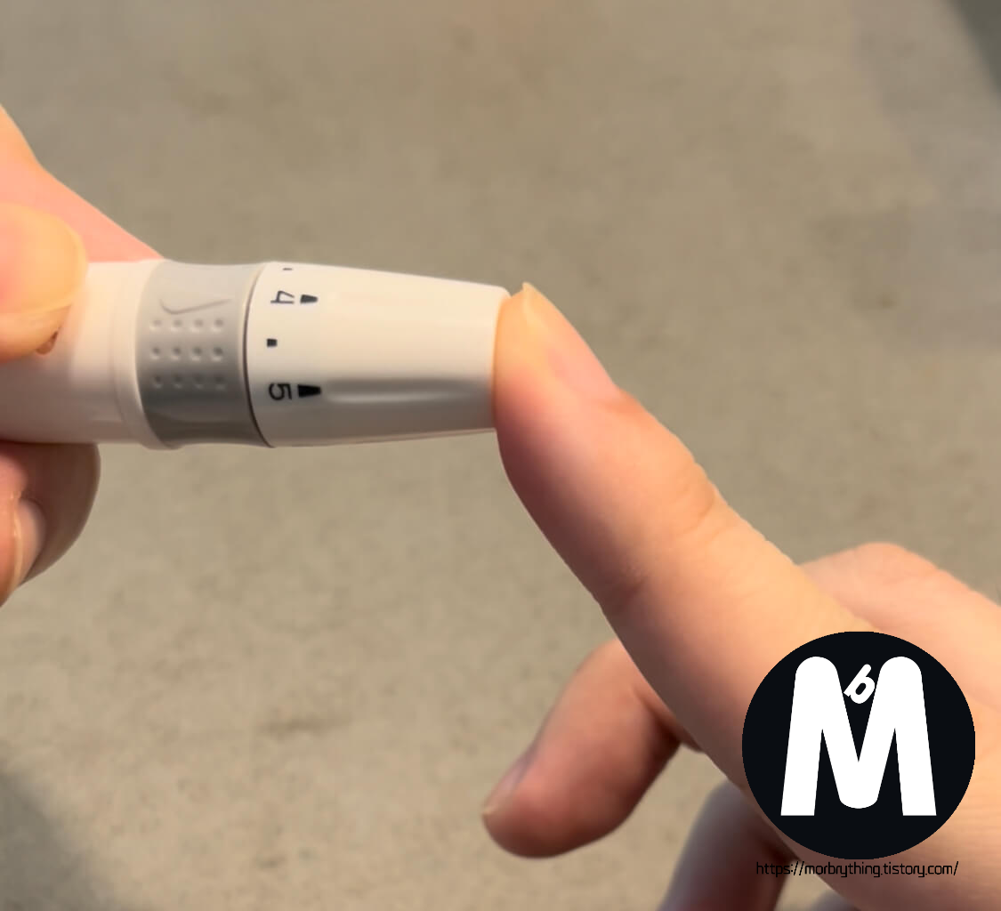 다시 채혈기로 돌아와서, 손가락 끝 부분을 채혈기에 접촉시킨 후 버튼을 눌러 채혈을 채취해줍니다. 채혈 채취전에 깊이 조정나사를 돌려 채혈 깊이를 조절할 수 있습니다. 숫자가 작을수록 연하고 얇은 피부에 적합하고, 숫자가 클수록 두꺼운 피부에 적합합니다.