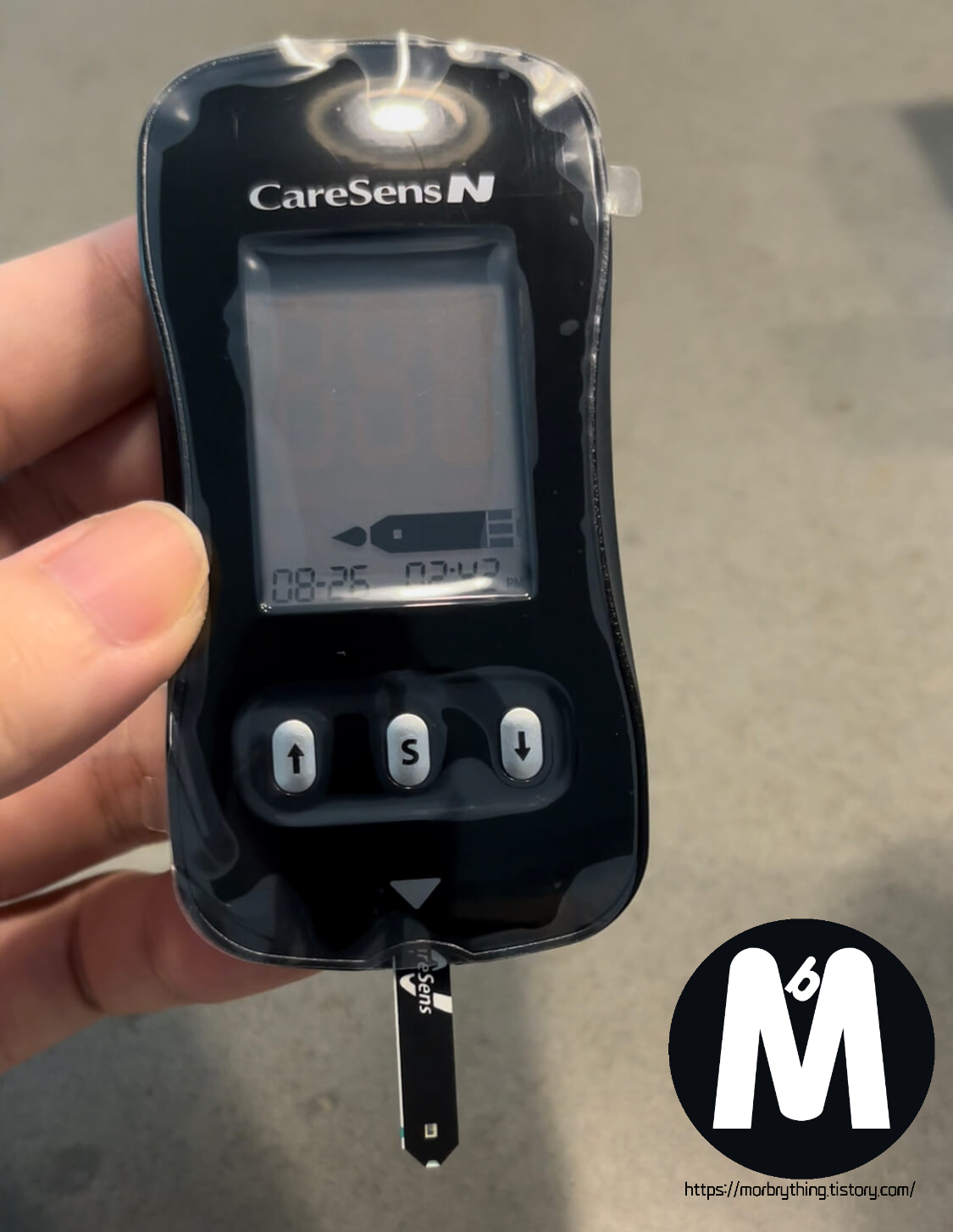 그 전에, 혈당측정 검사지를 혈당 측정기의 검사지 삽입구에 꽂아줍니다. 유의할 점은 반드시 사진과 같이 3개의 직사각형 모양이 그려진 쪽으로 넣어야 합니다! 거꾸로 넣으면 안됩니다.