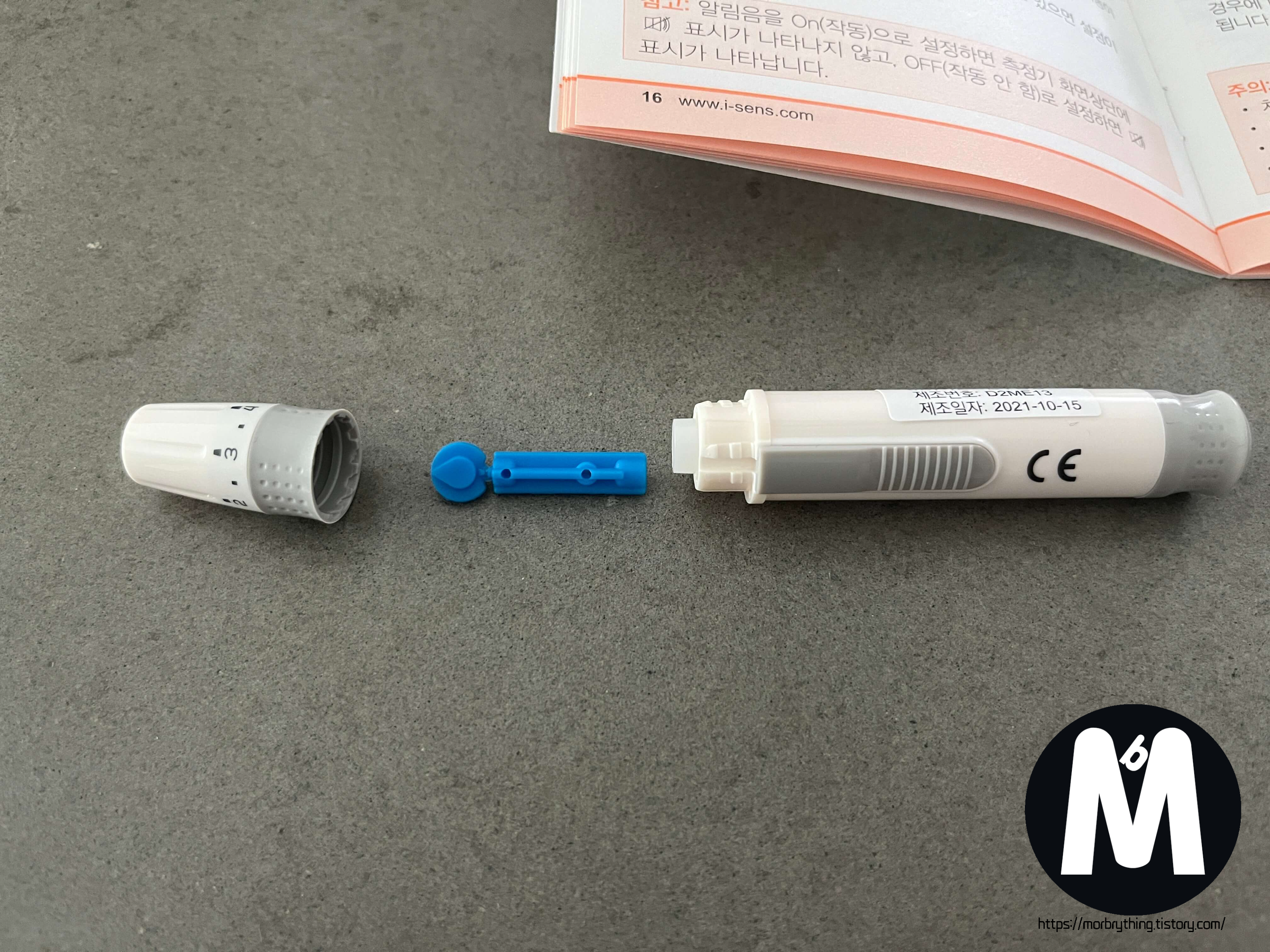 혈당 측정을 위해서는 측정자의 혈액이 필요합니다. 채혈기가 그 역할을 해주는데요. 먼저 채혈기의 뚜껑을 돌려서 열고 채혈침을 장착구에 꽂아줍니다. 그냥 더이상 들어가지 않을때까지 밀어넣으면 됩니다.
