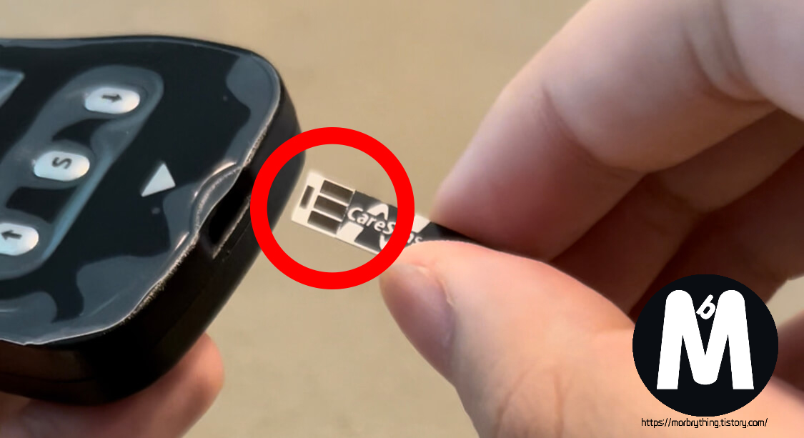 혈당 측정기에 꽂으면 알림 소리와 함께 화면에 검사지 모양의 아이콘이 표시됩니다. 이제 모든 준비는 완료되었습니다.