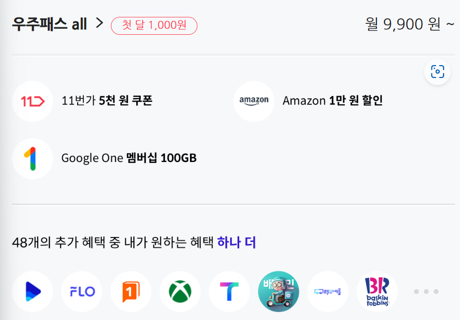 월 9,900원에 위의 3종 혜택 + 다양한 구독 상품 또는 할인쿠폰을 제공해주는 혜택을 이용할 수 있습니다.