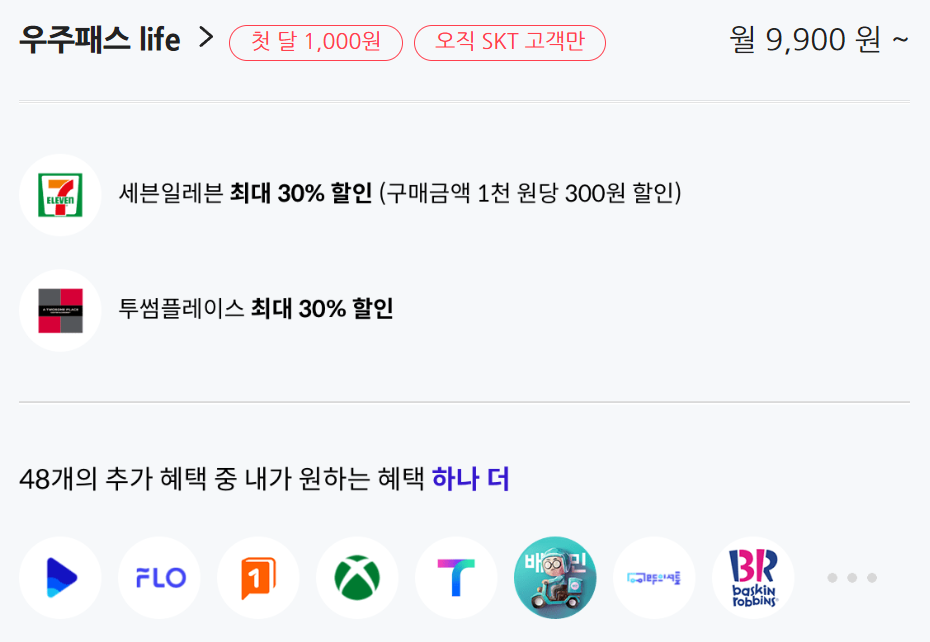 우주패스 life는 위의 우주패스 All과는 성격이 다른 상품으로, 오직 SKT 고객만 이용할 수 있습니다. 추후에 타사 고객들도 이용할 수 있게 하겠다고는 하는데 아직은 SKT 고객만 가능합니다.